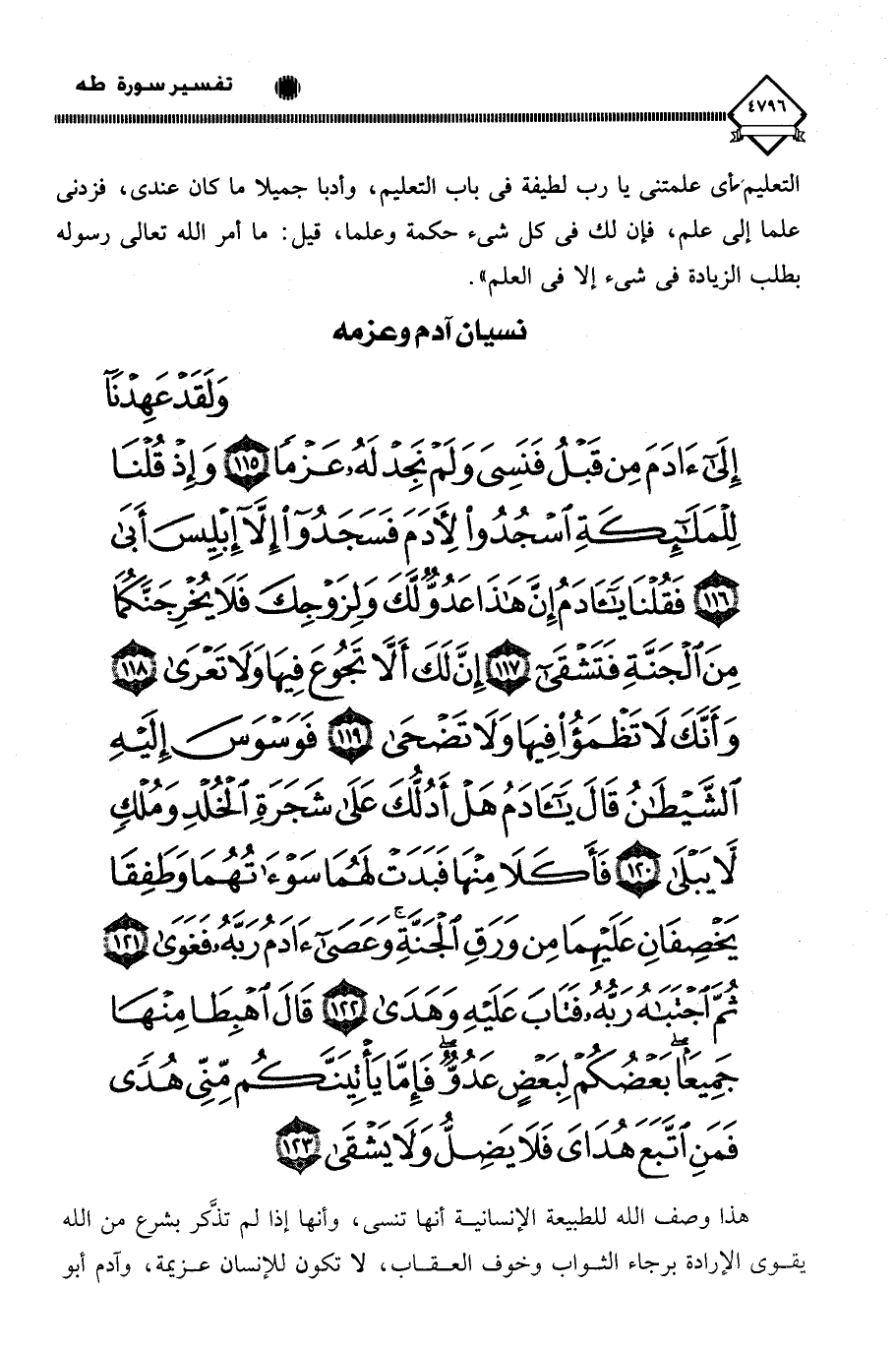 (وَلَقَدْ عَهِدْنَا إِلَى آدَمَ مِنْ قَبْلُ فَنَسِيَ وَلَمْ نَجِدْ لَهُ عَزْمًا (115) وَإِذْ قُلْنَا لِلْمَلَائِكَةِ اسْجُدُوا لِآدَمَ فَسَجَدُوا إِلَّا إِبْلِيسَ أَبَى (116) فَقُلْنَا يَا آدَمُ إِنَّ هَذَا عَدُوٌّ لَكَ وَلِزَوْجِكَ فَلَا يُخْرِجَنَّكُمَا مِنَ الْجَنَّةِ فَتَشْقَى (117) إِنَّ لَكَ أَلَّا تَجُوعَ فِيهَا وَلَا تَعْرَى (118) وَأَنَّكَ لَا تَظْمَأُ فِيهَا وَلَا تَضْحَى (119) فَوَسْوَسَ إِلَيْهِ الشَّيْطَانُ قَالَ يَا آدَمُ هَلْ أَدُلُّكَ عَلَى شَجَرَةِ الْخُلْدِ وَمُلْكٍ لَا يَبْلَى (120) فَأَكَلَا مِنْهَا فَبَدَتْ لَهُمَا سَوْءَاتُهُمَا وَطَفِقَا يَخْصِفَانِ عَلَيْهِمَا مِنْ وَرَقِ الْجَنَّةِ وَعَصَى آدَمُ رَبَّهُ فَغَوَى (121) ثُمَّ اجْتَبَاهُ رَبُّهُ فَتَابَ عَلَيْهِ وَهَدَى (122) قَالَ اهْبِطَا مِنْهَا جَمِيعًا بَعْضُكُمْ لِبَعْضٍ عَدُوٌّ فَإِمَّا يَأْتِيَنَّكُمْ مِنِّي هُدًى فَمَنِ اتَّبَعَ هُدَايَ فَلَا يَضِلُّ وَلَا يَشْقَى (123)