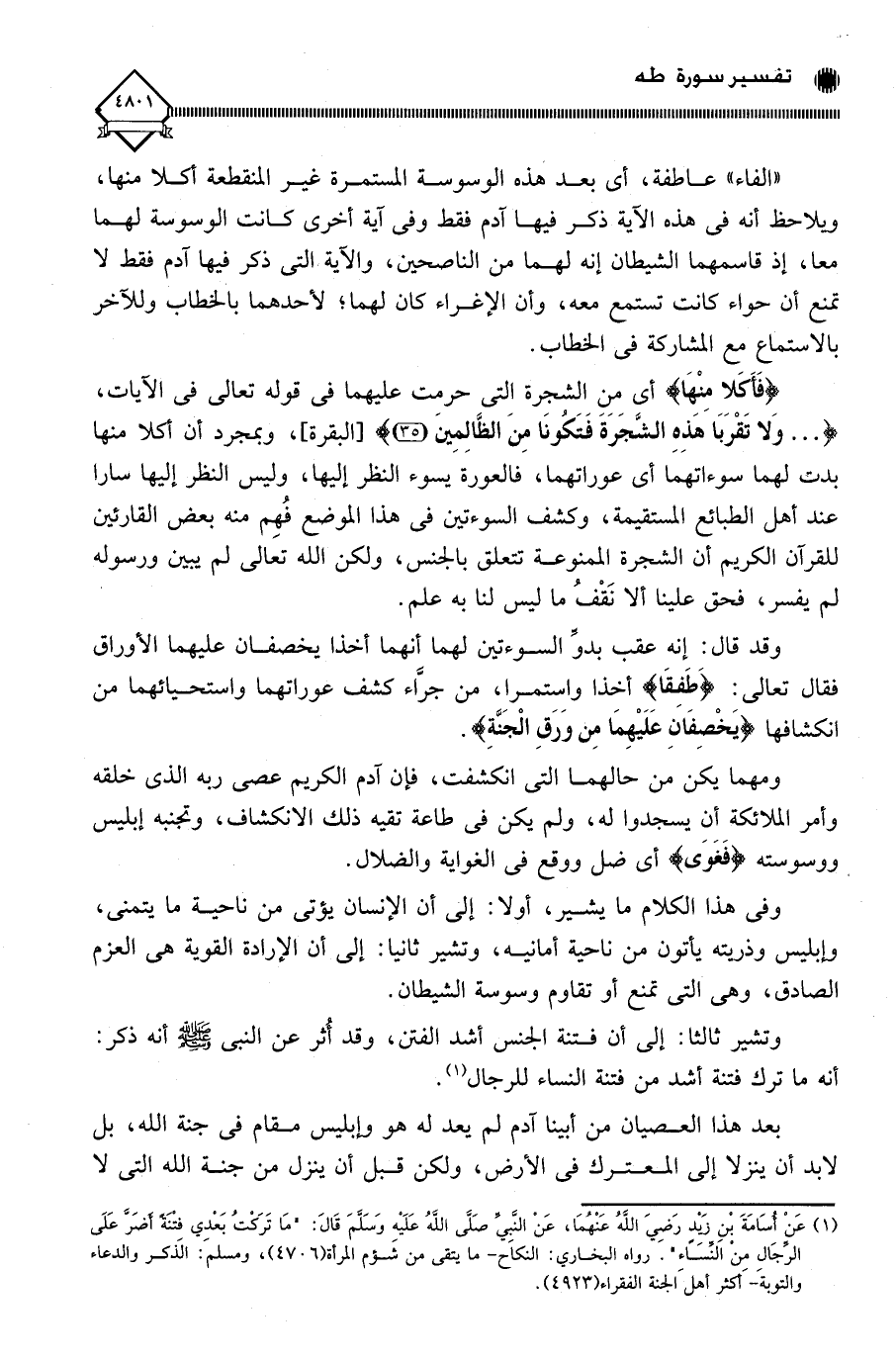(فَأَكَلا منْهَا) أي من الشجرة التي حرمت عليهما في قوله تعالى في الآيات، (. . . ولا تَقْرَبَاً هَذِهِ الشَّجَرَةَ فَتَكُونَا مِنَ الظَّالِمِينَ)، وبمجرد أن أكلا منها بدت لهما سوءاتهما أي عوراتهما، فالعورة يسوء النظر إليها، وليس النظر إليها سارا عند أهل الطبائع المستقيمة، وكشف السوءتين في هذا الموضع فُهِم منه بعض القارئين للقرآن الكريم أن الشجرة الممنوعة تتعلق بالجنس، ولكن الله تعالى لم يبين ورسوله لم يفسر، فحق علينا ألا نَقْف ما ليس لنا به علم.