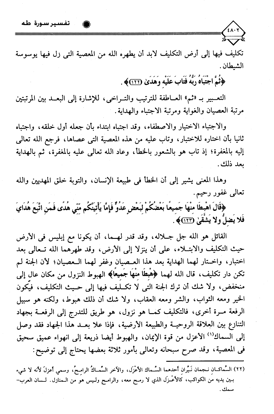 القائل هو الله جل جلاله، وقد قدر لهما، أن يكونا مع إبليس في الأرض حيث التكليف والابتلاء، على أن ينزلا إلى الأرض، وقد طهرهما الله تعالى بعد اختبار، واختار لهما الهداية بعد هذا العصيان وغفر لهما العصيان؛ لأن الجنة لم تكن دار تكليف، قال الله لهما (اهْبطَا منْهَا جَميعًا) الهبوط النزول من مكان عال إلى منخفض، ولا شك أن ترك الجنة التَى لَا تكلَيف فيها إلى حيث التكليف، فيكون الخير ومعه الثواب، والشر ومعه العقاب، ولا شك أن ذلك هبوط، ولكنه هو سبيل الرفعة مرة أخرى، فالتكليف كما هو نزول، هو طريق للتدرج إلى الرفعة بجهاد التنازع بين العلاقة الروحية والطبيعة الأرضية، فإذا علا بعد هذا الجهاد فقد وصل إلى السماك (¬1) الأعزل من قوة الإيمان، والهبوط أيضا ذريعة إلى انهواء عميق سحيق في المعصية، وقد صرح سبحانه وتعالى بأمور ثلاثة بعضها يحتاج إلى توضيح: