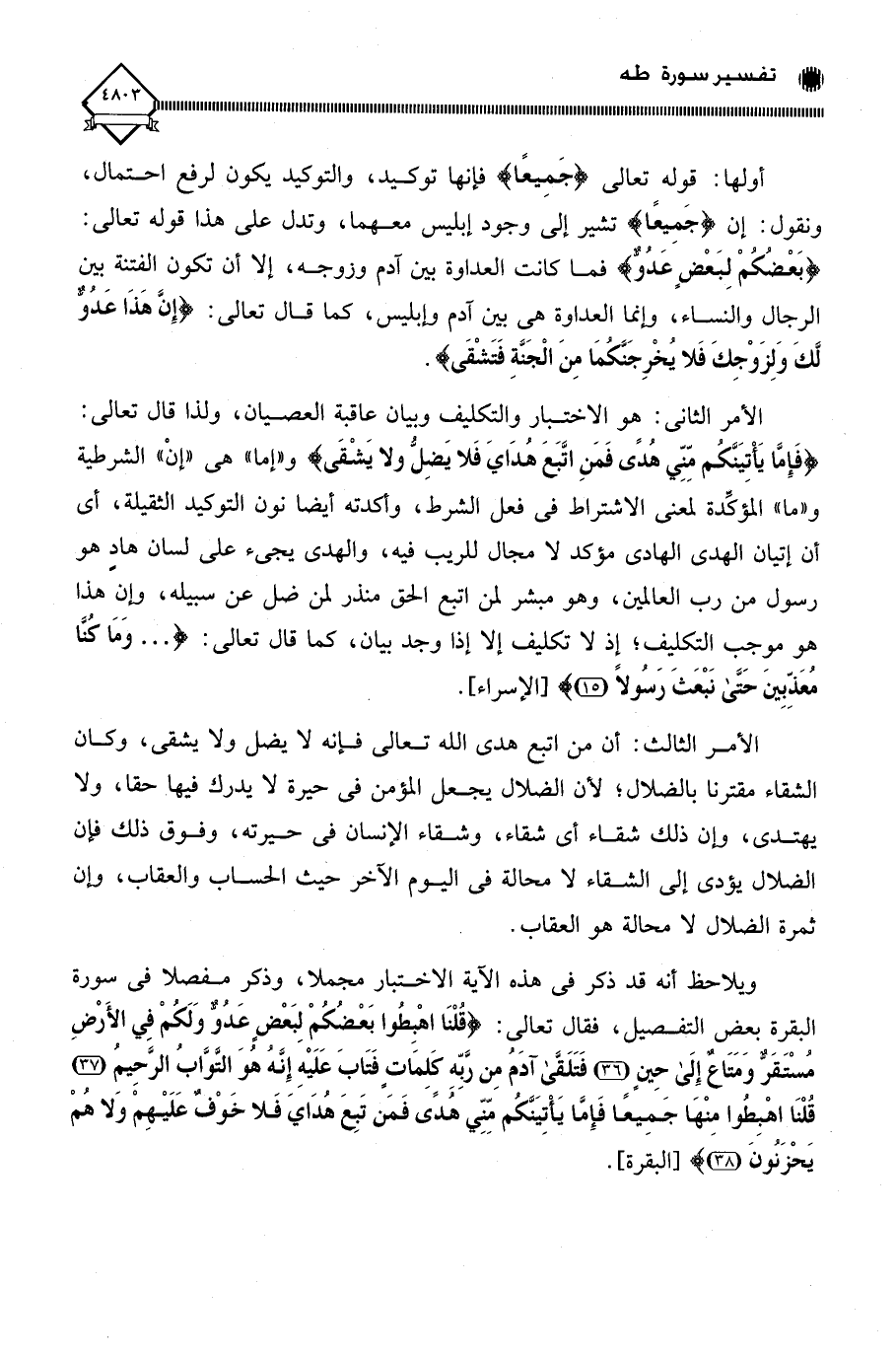(فَإِمَّا يَأْتِيَنَّكُمْ مِنِّي هُدًى فَمَنِ اتَّبَعَ هُدَايَ فَلَا يَضِلُّ وَلَا يَشْقَى) و " إما " هي " إنْ " الشرطية و " ما " المؤكِّدة لمعنى الاشتراط في فعل الشرط، وأكدته أيضا نون التوكيد الثقيلة، أي أن إتيان الهدى الهادي مؤكد لَا مجال للريب فيه، والهدى يجيء على لسان هادٍ هو رسول من رب العالمين، وهو مبشر لمن اتبع الحق منذر لمن ضل عن سبيله، وإن هذا هو موجب التكليف؛ إذ لَا تكليف إلا إذا وجد بيان، كما قال تعالى: (. . . (وَمَا كُنَّا مُعَذِّبِينَ حَتَّى نَبْعَثَ رَسُولًا).