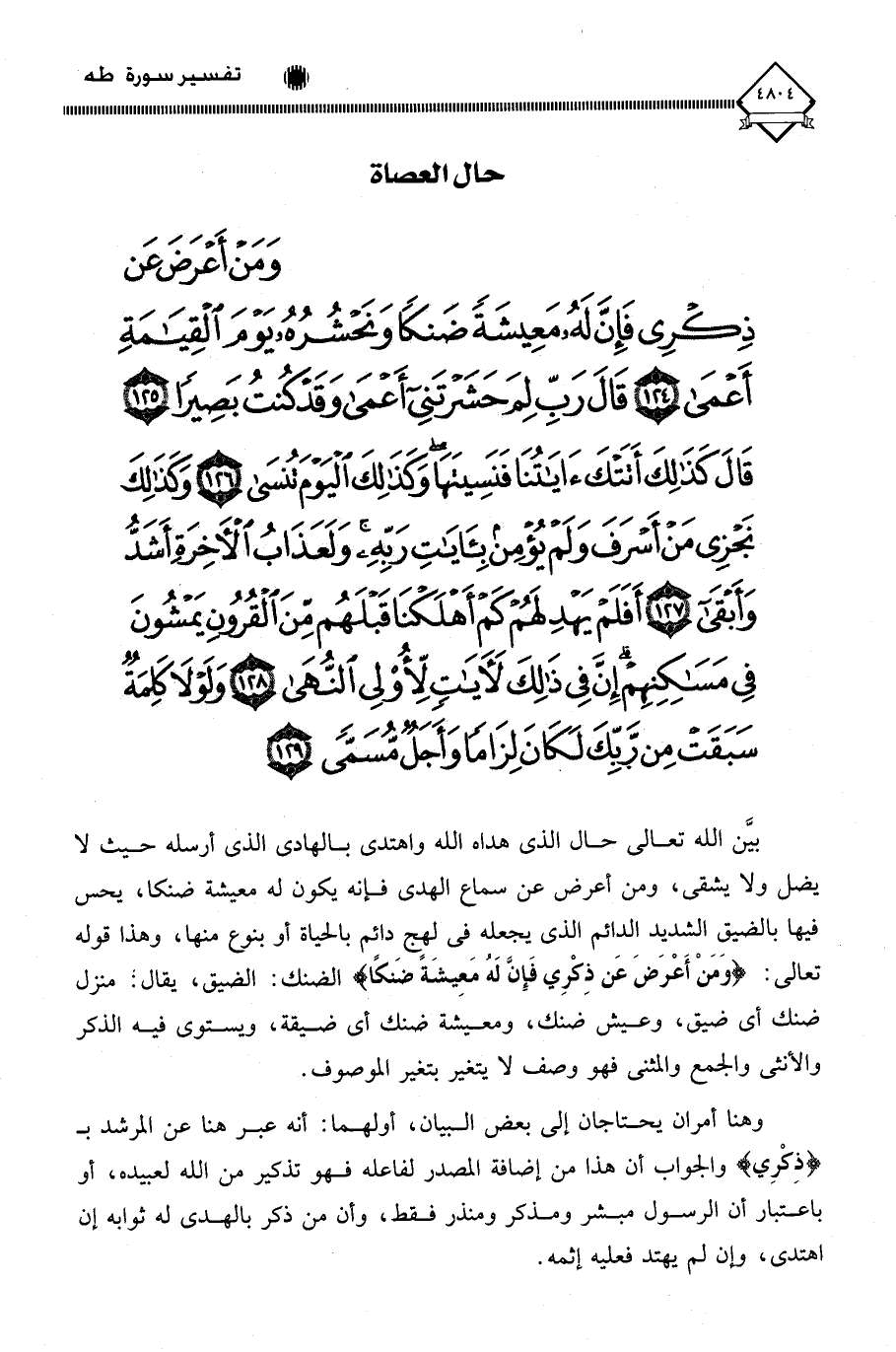 (وَمَنْ أَعْرَضَ عَنْ ذِكْرِي فَإِنَّ لَهُ مَعِيشَةً ضَنْكًا وَنَحْشُرُهُ يَوْمَ الْقِيَامَةِ أَعْمَى (124) قَالَ رَبِّ لِمَ حَشَرْتَنِي أَعْمَى وَقَدْ كُنْتُ بَصِيرًا (125) قَالَ كَذَلِكَ أَتَتْكَ آيَاتُنَا فَنَسِيتَهَا وَكَذَلِكَ الْيَوْمَ تُنْسَى (126) وَكَذَلِكَ نَجْزِي مَنْ أَسْرَفَ وَلَمْ يُؤْمِنْ بِآيَاتِ رَبِّهِ وَلَعَذَابُ الْآخِرَةِ أَشَدُّ وَأَبْقَى (127) أَفَلَمْ يَهْدِ لَهُمْ كَمْ أَهْلَكْنَا قَبْلَهُمْ مِنَ الْقُرُونِ يَمْشُونَ فِي مَسَاكِنِهِمْ إِنَّ فِي ذَلِكَ لَآيَاتٍ لِأُولِي النُّهَى (128) وَلَوْلَا كَلِمَةٌ سَبَقَتْ مِنْ رَبِّكَ لَكَانَ لِزَامًا وَأَجَلٌ مُسَمًّى (129)