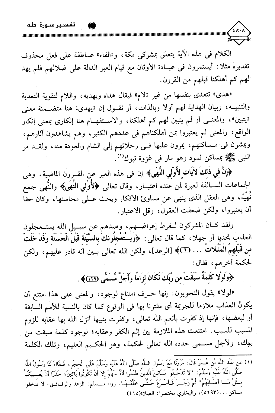 (إِنَّ فِي ذَلِكَ لآيَاتٍ لأُوْلِي النُّهَى) إن في هذه العبر عن القرون الماضية، وهي الجماعات السالفة لعبرة لمن عنده اعتبار، وقال تعالى (لأُوْلِي النُّهَى) والنُّهى جمع نُهْيَة، وهي العقل الذي ينهى عن مساوئ الأفكار ويحث على محاسنها، وكان حقا أن يعتبروا، ولكن ضعفت العقول، وقلَّ الاعتبار.