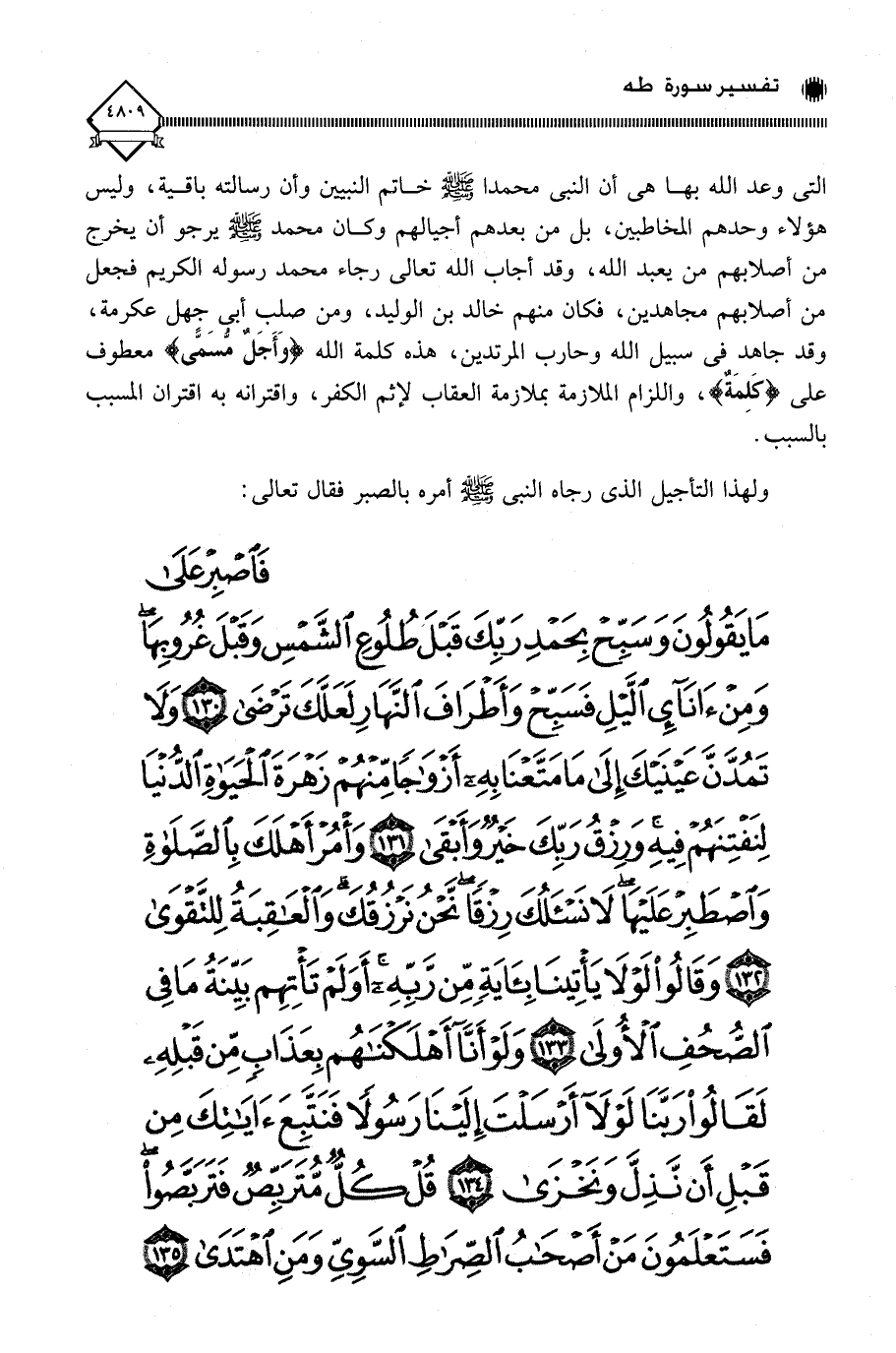 (فَاصْبِرْ عَلَى مَا يَقُولُونَ وَسَبِّحْ بِحَمْدِ رَبِّكَ قَبْلَ طُلُوعِ الشَّمْسِ وَقَبْلَ غُرُوبِهَا وَمِنْ آنَاءِ اللَّيْلِ فَسَبِّحْ وَأَطْرَافَ النَّهَارِ لَعَلَّكَ تَرْضَى (130) وَلَا تَمُدَّنَّ عَيْنَيْكَ إِلَى مَا مَتَّعْنَا بِهِ أَزْوَاجًا مِنْهُمْ زَهْرَةَ الْحَيَاةِ الدُّنْيَا لِنَفْتِنَهُمْ فِيهِ وَرِزْقُ رَبِّكَ خَيْرٌ وَأَبْقَى (131) وَأْمُرْ أَهْلَكَ بِالصَّلَاةِ وَاصْطَبِرْ عَلَيْهَا لَا نَسْأَلُكَ رِزْقًا نَحْنُ نَرْزُقُكَ وَالْعَاقِبَةُ لِلتَّقْوَى (132) وَقَالُوا لَوْلَا يَأْتِينَا بِآيَةٍ مِنْ رَبِّهِ أَوَلَمْ تَأْتِهِمْ بَيِّنَةُ مَا فِي الصُّحُفِ الْأُولَى (133) وَلَوْ أَنَّا أَهْلَكْنَاهُمْ بِعَذَابٍ مِنْ قَبْلِهِ لَقَالُوا رَبَّنَا لَوْلَا أَرْسَلْتَ إِلَيْنَا رَسُولًا فَنَتَّبِعَ آيَاتِكَ مِنْ قَبْلِ أَنْ نَذِلَّ وَنَخْزَى (134) قُلْ كُلٌّ مُتَرَبِّصٌ فَتَرَبَّصُوا فَسَتَعْلَمُونَ مَنْ أَصْحَابُ الصِّرَاطِ السَّوِيِّ وَمَنِ اهْتَدَى (135)
