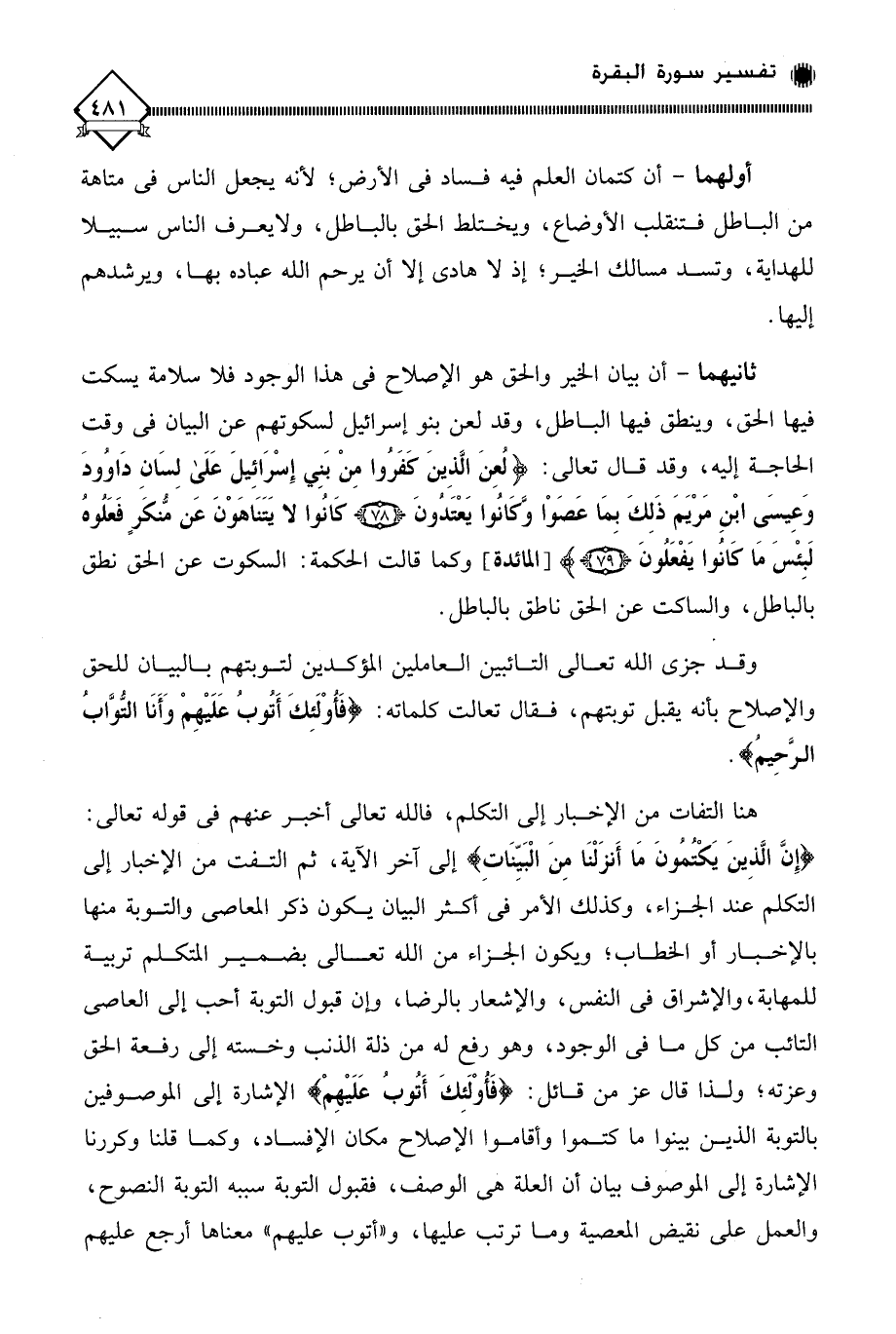ثانيهما - أن بيان الخير والحق هو الإصلاح في هذا الوجود فلا سلامة يسكت فيها الحق، وينطق فيها الباطل، وقد لعن بنو إسرائيل لسكوتهم عن البيان في وقت الحاجة إليه، وقد قال تعالى: (لُعِنَ الَّذِينَ كَفَرُوا مِنْ بَنِي إِسْرَائِيلَ عَلَى لِسَانِ دَاوُودَ وَعِيسَى ابْنِ مَرْيَمَ ذَلِكَ بِمَا عَصَوْا وَكَانُوا يَعْتَدُونَ (78) كَانُوا لَا يَتَنَاهَوْنَ عَنْ مُنْكَرٍ فَعَلُوهُ لَبِئْسَ مَا كَانُوا يَفْعَلُونَ (79). وكما قالت الحكمة: السكوت عن الحق نطق بالباطل، والساكت عن الحق ناطق بالباطل.