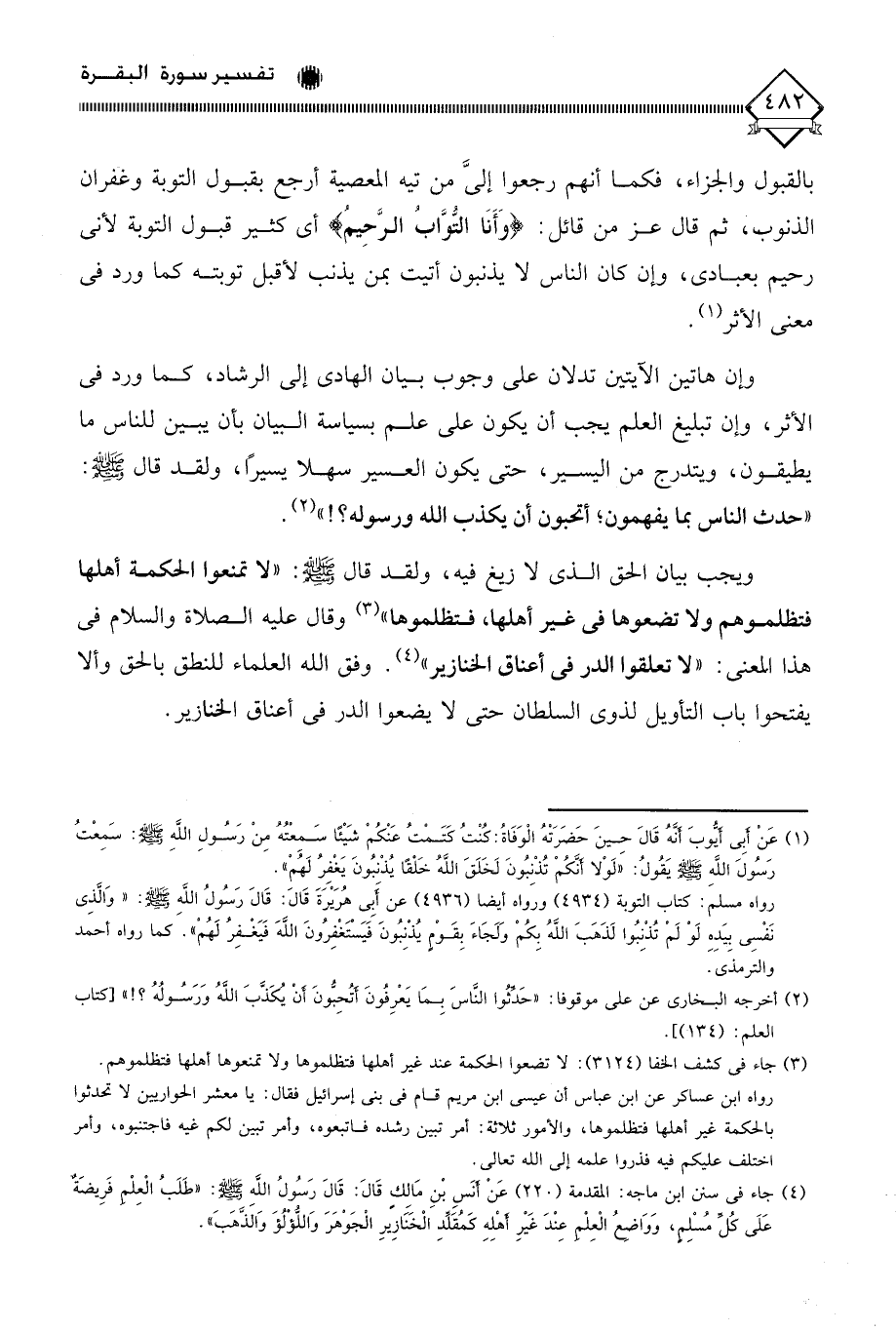 (¬4) جاء في سنن ابن ماجه: المقدمة (220) عَنْ أنَسِ بْنِ مَالكٍ قَالَ: قَالَ رَسُولُ اللَّه - صلى الله عليه وسلم -: " طَلَبُ الْعِلْم فَرِيضَةٌ عَلَى كُل مُسْلِم، وَوَاضِعُ الْعِلْم عِنْدَ غَيْرِ أهْلِهِ كَمُقَلِّدِ الْخَنًازِيرِ الْجَوْهَرَ وَاللؤْلُؤَ وَالَذَّهَبَ ".