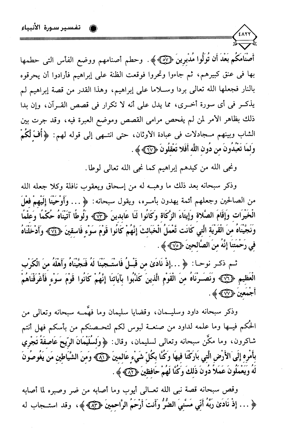 وذكر سبحانه داود وسليمان، وقضايا سليمان وما فهَّمه سبحانه وتعالى من الحكم فيها وما علمه لداود من صنعة لبوس لكم لتحصنكم من بأسكم فهل أنتم شاكرون، وما مكَّن سبحانه وتعالى لسليمان، وقال: (وَلِسُلَيْمَانَ الرِّيحَ عَاصِفَةً تَجْرِي بِأَمْرِهِ إِلَى الْأَرْضِ الَّتِي بَارَكْنَا فِيهَا وَكُنَّا بِكُلِّ شَيْءٍ عَالِمِينَ (81) وَمِنَ الشَّيَاطِينِ مَنْ يَغُوصُونَ لَهُ وَيَعْمَلُونَ عَمَلًا دُونَ ذَلِكَ وَكُنَّا لَهُمْ حَافِظِينَ (82).