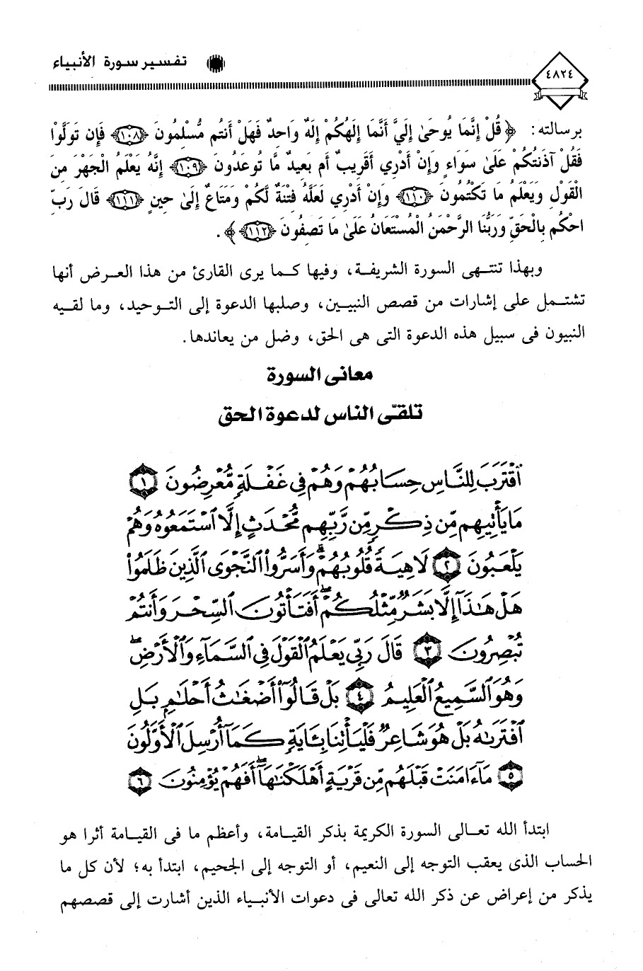 (اقْتَرَبَ لِلنَّاسِ حِسَابُهُمْ وَهُمْ فِي غَفْلَةٍ مُعْرِضُونَ (1) مَا يَأْتِيهِمْ مِنْ ذِكْرٍ مِنْ رَبِّهِمْ مُحْدَثٍ إِلَّا اسْتَمَعُوهُ وَهُمْ يَلْعَبُونَ (2) لَاهِيَةً قُلُوبُهُمْ وَأَسَرُّوا النَّجْوَى الَّذِينَ ظَلَمُوا هَلْ هَذَا إِلَّا بَشَرٌ مِثْلُكُمْ أَفَتَأْتُونَ السِّحْرَ وَأَنْتُمْ تُبْصِرُونَ (3) قَالَ رَبِّي يَعْلَمُ الْقَوْلَ فِي السَّمَاءِ وَالْأَرْضِ وَهُوَ السَّمِيعُ الْعَلِيمُ (4) بَلْ قَالُوا أَضْغَاثُ أَحْلَامٍ بَلِ افْتَرَاهُ بَلْ هُوَ شَاعِرٌ فَلْيَأْتِنَا بِآيَةٍ كَمَا أُرْسِلَ الْأَوَّلُونَ (5) مَا آمَنَتْ قَبْلَهُمْ مِنْ قَرْيَةٍ أَهْلَكْنَاهَا أَفَهُمْ يُؤْمِنُونَ (6)