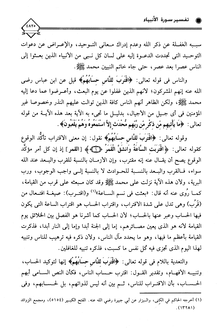 (مَا يَأْتِيهِمْ مِنْ ذِكْرٍ مِنْ رَبِّهِمْ مُحْدَثٍ إِلَّا اسْتَمَعُوهُ وَهُمْ يَلْعَبُونَ (2) وقوله تعالى: (اقْتَرَبَ لِلنَّاسِ حِسَابُهُمْ) نقول: إن معنى الاقتراب تأكُّد الوقوع كقوله تعالى: (اقْتَرَبَتِ السَّاعَة وَانشَقَّ الْقَمَرُ)، إذ إن كل أمر مؤكَّد الوقوع يصح أن يقال عنه إنه مقترب، وإن الأزمان بالنسبة للقرب والبعد عند الله سواء، فالقرب والبعد بالنسبة للحوادث لَا بالنسبة إلى واجب الوجوب، ورب البرية، ولأن هذه الآية نزلت على محمد - صلى الله عليه وسلم - وقد كان مبعثه على قرب من القيامة، كما رُوي عنه أنه قال: " بعثت في نسم الساعة " (¬1) و (اقترب): صيغة افتعال من (قَرُب) وهي تدل على شدة الاقتراب، واقتراب الحساب هو اقتراب الساعة التي يكون فيها الحساب وعبر عنها بالحساب؛ لأن الحساب كما أشرنا هو الفصل بين الخلائق يوم القيامة لأنه هو الذي يعين مصائرهم، إما إلى الجنة أبدا وإما إلى النار أبدا، فذكرت القيامة بأعظم ما فيها، وهو ما يحدد مآل الناس، ولأن ذكره فيه ترهيب للناس وتنبيه لهذا اليوم الذي تجزى فيه كل نفس ما كسبت، فذكره تنبيه للغافلين.