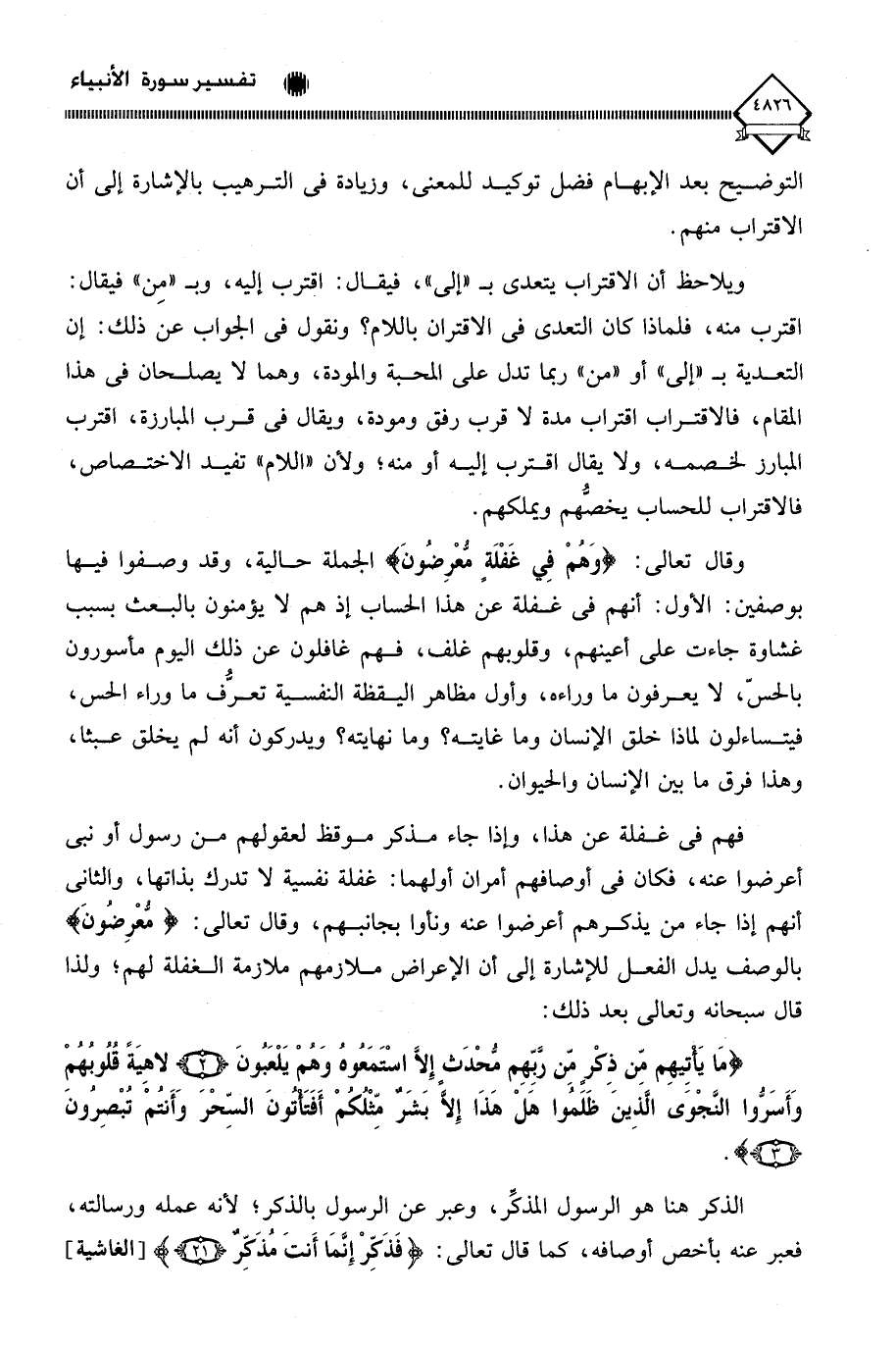 وقال تعالى: (وَهُمْ فِي غَفْلَة معْرِضُونَ) الجملة حالية، وقد وصفوا فيها بوصفين: الأول: أنهم في غفلة عن هذا الحساب إذ هم لَا يؤمنون بالبعث بسبب غشاوة جاءت على أعينهم، وقلوبهم غلف، فهم غافلون عن ذلك اليوم مأسورون بالحسّ، لَا يعرفون ما وراءه، وأول مظاهر اليقظة النفسية تعرُّف ما وراء الحس، فيتساءلون لماذا خلق الإنسان وما غايته؟ وما نهايته؟ ويدركون أنه لم يخلق عبثا، وهذا فرق ما بين الإنسان والحيوان.