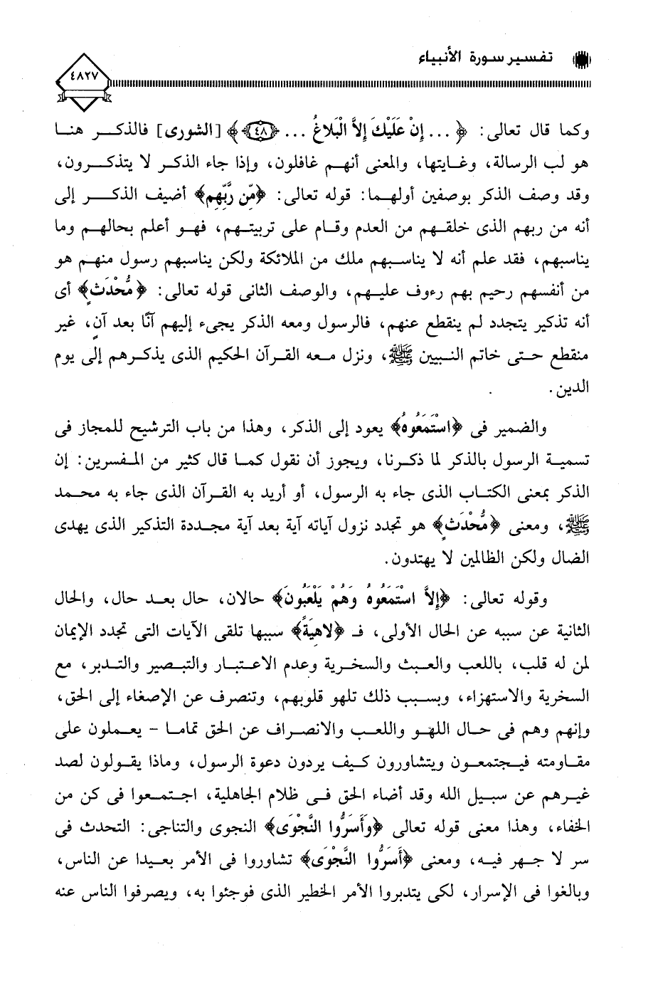 وكما قال تعالى: (. . . إِنْ عَلَيْكَ إِلَّا الْبَلاغُ. . .)، فالذكر هنا هو لب الرسالة، وغايتها، والمعنى أنهم غافلون، وإذا جاء الذكر لَا يتذكرون، وقد وصف الذكر بوصفين أولهما: قوله تعالى: (مِّن رَّبِّهِم) أضيف الذكر إلى أنه من ربهم الذي خلقهم من العدم وقام على تربيتهم، فهو أعلم بحالهم وما يناسبهم، فقد علم أنه لَا يناسبهم ملك من الملائكة ولكن يناسبهم رسول منهم هو من أنفسهم رحيم بهم رءوف عليهم، والوصف الثاني قوله تعالى: (مُحْدَثٍ) أي أنه تذكير يتجدد لم ينقطع عنهم، فالرسول ومعه الذكر يجيء إليهم آنًا بعد آنٍ، غير منقطع حتى خاتم النبيين - صلى الله عليه وسلم -، ونزل معه القرآن الحكيم الذي يذكرهم إلى يوم الدين.