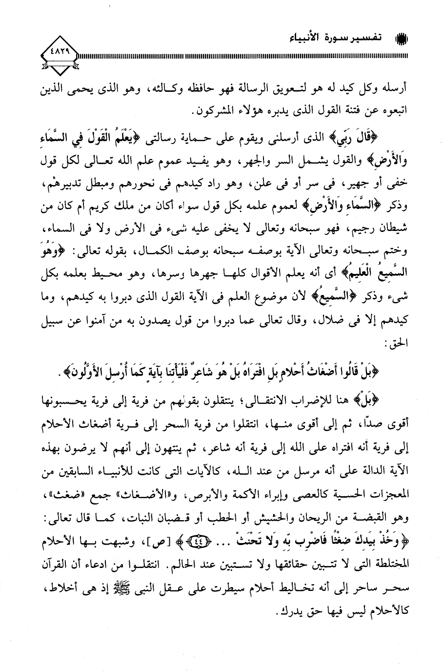 (بَلْ قَالُوا أَضْغَاثُ أَحْلَامٍ بَلِ افْتَرَاهُ بَلْ هُوَ شَاعِرٌ فَلْيَأْتِنَا بِآيَةٍ كَمَا أُرْسِلَ الْأَوَّلُونَ (5) (بَلْ) هنا للإضراب الانتقالي؛ ينتقلون بقولهم من فرية إلى فرية يحسبونها أقوى صدّا، ثم إلى أقوى منها، انتقلوا من فرية السحر إلى فرية أضغاث الأحلام إلى فرية أنه افتراه على الله إلى فرية أنه شاعر، ثم ينتهون إلى أنهم لَا يرضون بهذه الآية الدالة على أنه مرسل من عند الله، كالآيات التي كانت للأنبياء السابقين من المعجزات الحسية كالعصي وإبراء الأكمه والأبرص، و " الأضغاث " جمع " ضغث "، وهو القبضة من الريحان والحشيش أو الحطب أو قضبان النبات، كما قال تعالى: