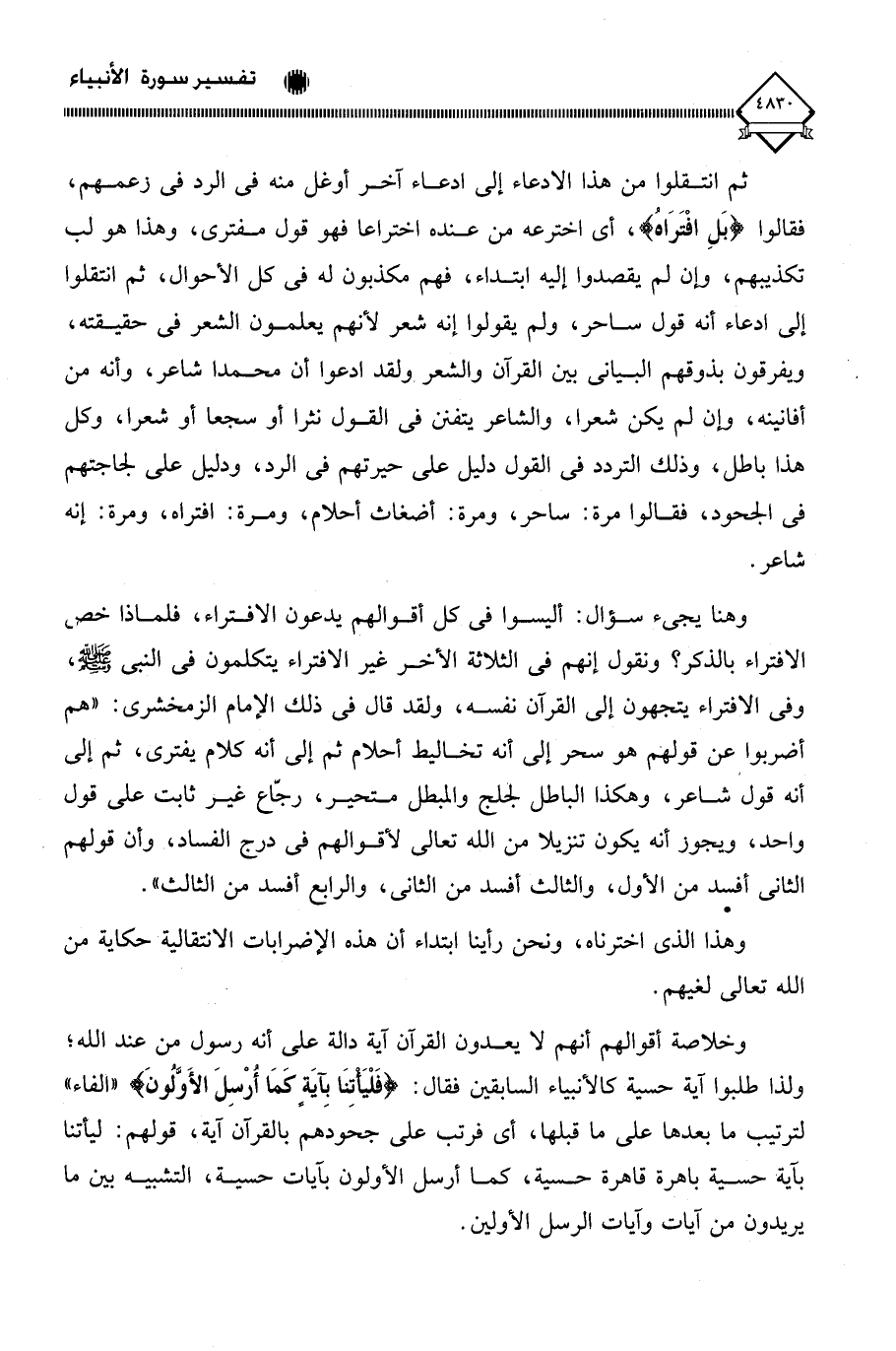ثم انتقلوا من هذا الادعاء إلى ادعاء آخر أوغل منه في الرد في زعمهم، فقالوا (بَلِ افْتَرَاهُ)، أي اخترعه من عنده اختراعا فهو قول مفترى، وهذا هو لب تكذيبهم، وإن لم يقصدوا إليه ابتداء، فهم مكذبون له في كل الأحوال، ثم انتقلوا إلى ادعاء أنه قول ساحر، ولم يقولوا إنه شعر لأنهم يعلمون الشعر في حقيقته، ويفرقون بذوقهم البياني بين القرآن والشعر، ولقد ادعوا أن محمدا شاعر، وأنه من أفانينه، وإن لم يكن شعرا، والشاعر يتفق في القول نثرا أو سجعا أو شعرا، وكل هذا باطل، وذلك التردد في القول دليل على حيرتهم في الرد، ودليل على لجاجتهم في الجحود، فقالوا مرة: ساحر، ومرة: أضغاث أحلام، ومرة: افتراه، ومرة: إنه شاعر. وهنا يجيء سؤال: أليسوا في كل أقوالهم يدعون الافتراء، فلماذا خص الافتراء بالذكر؟ ونقول إنهم في الثلاثة الأخر غير الافتراء يتكلمون في النبي - صلى الله عليه وسلم -، وفى الافتراء يتجهون إلى القرآن نفسه، ولقد قال في ذلك الإمام الزمخشري: " هم أضربوا عن قولهم هو سحر إلى أنه تخاليط أحلام ثم إلى أنه كلام يفترى، ثم إلى أنه قول " شاعر، وهكذا الباطل لجلج والمبطل متحير، رجَّاع غير ثابت على قول واحد، ويجوز أنه يكون تنزيلا من الله تعالى لأقوالهم في درج الفساد، وأن قولهم الثاني أفسد من الأول، والثالث أفسد من الثاني، والرابع أفسد من الثالث ".