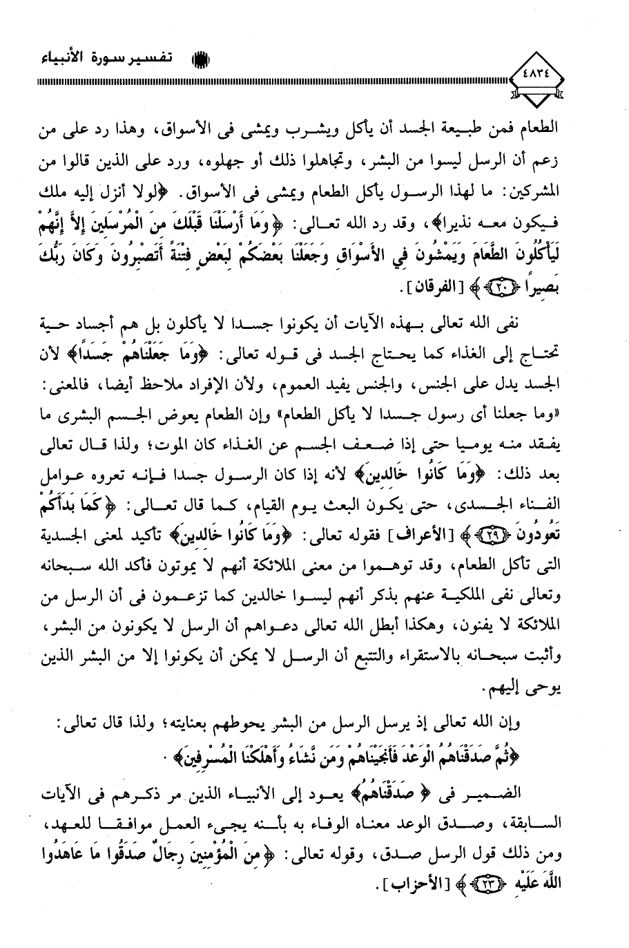نفَى الله تعالى بهذه الآيات أن يكونوا جسدا لَا يأكلون بل هم أجساد حية تحتاج إلى الغذاء كما يحتاج الجسد في قوله تعالى: (وَمَا جَعَلْنَاهُم جَسَدًا) لأن الجسد يدل على الجنس، والجنس يفيد العموم، ولأن الإفراد ملاحظ أيضا، فالمعنى: " وما جعلنا أي رسول جسدا لَا يأكل الطعام، وإن الطعام يعوض الجسم البشري ما يفقد منه يوميا حتى إذا ضعف الجسم عن الغذاء كان الموت؛ ولذا قال تعالى بعد ذلك: (وَمَا كَانُوا خَالدينَ) لأنه إذا كان الرسول جسدا فإنه تعروه عوامل الفناء الجسدي، حتى - يكَوَن البعث يوم القيام، كما قال تعالى: (كمَا بَدَأَكمْ تَعُودُونَ)، فقوله تعالى: (وَمَا كانوا خَالِدِينَ) تأكيد لمعنى الجسدية التي تأكل الطعام، وقد توهموا من معنى الملائكة أنهم لَا يموتون فأكد الله سبحانه وتعالى نفي الملكية عنهم بذكر أنهم ليسوا خالدين كما تزعمون في أن الرسل من الملائكة لَا يفنون، وهكذا أبطل الله تعالى دعواهم أن الرسل لَا يكونون من البشر، وأثبت سبحانه بالاستقراء والتتبع أن الرسل لَا يمكن أن يكونوا إلا من البشر الذين يوحى إليهم.