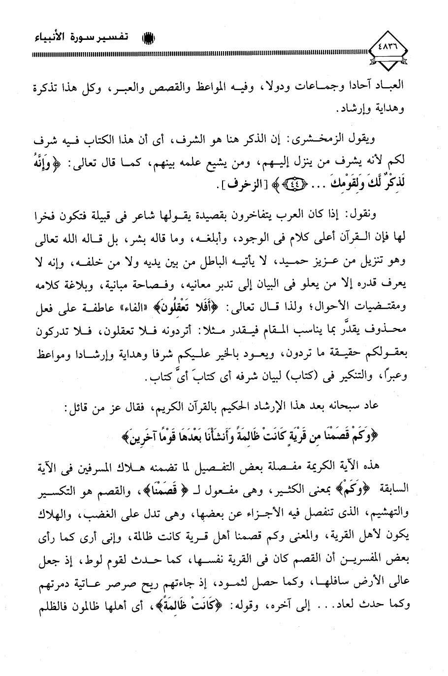 هذه الآية الكريمة مفصلة بعض التفصيل لما تضمنه هلاك المسرفين في الآية السابقة (وَكَمْ) بمعنى الكثير، وهي مفعول لـ (قَصَمْنَا)، والقصم هو التكسير والتهشيم، الذي تنفصل فيه الأجزاء عن بعضها، وهي تدل على الغضب، والهلاك يكون لأهل القرية، والمعنى وكم قصمنا أهل قرية كانت ظالمة، وإني أرى كما رأى بعض المفسرين أن القصم كان في القرية نفسها، كما حدث لقوم لوط، إذ جعل عالي الأرض سافلها، وكما حصل لثمود، إذ جاءتهم ريح صرصر عاتية دمرتهم وكما حدث لعاد. . . إلى آخره، وقوله: (كَانَتْ ظَالِمَةَ)، أي أهلها ظالمون فالظلم