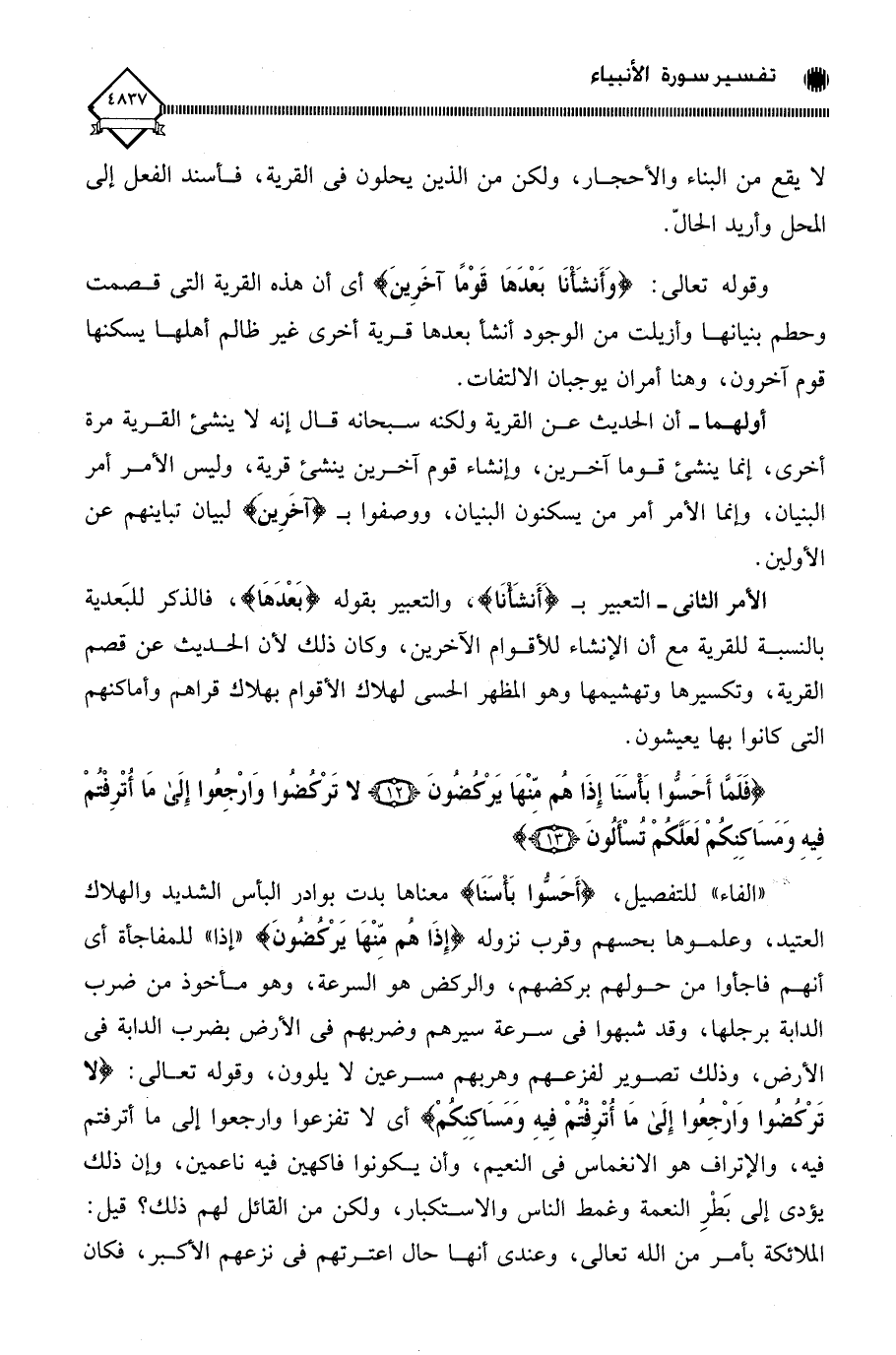 " الفاء " للتفصيل، (أَحَسُّوا بَأْسَنَا) معناها بدت بوادر البأس الشديد والهلاك العتيد، وعلموها بحسهم وقرب نزوله (إِذَا هُم مِّنْهَا يَرْكُضُونَ) " إذا " للمفاجأة أي أنهم فاجأوا من حولهم بركضهم، والركض هو السرعة، وهو مأخوذ من ضرب الدابة برجلها، وقد شبهوا في سرعة سيرهم وضربهم في الأرض بضرب، الدابة في الأرض، وذلك تصوير لفزعهم وهربهم مسرعين لَا يلوون، وقوله تعالى: