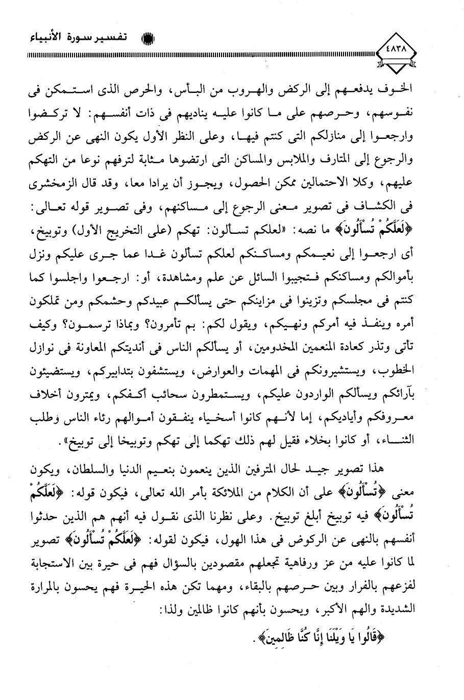 الخوف يدفعهم إلى الركض والهروب من البأس، والحرص الذي استمكن في نفوسهم، وحرصهم على ما كانوا عليه يناديهم في ذات أنفسهم: لَا تركضوا وارجعوا إلى منازلكم التي كنتم فيها، وعلى النظر الأول يكون النهي عن الركض والرجوع إلى المتارف والملابس والمساكن التي ارتضوها مثابة لترفهم نوعا من التهكم عليهم، وكلا الاحتمالين ممكن الحصول، ويجوز أن يرادا معا، وقد قال الزمخشري في الكشاف في تصوير معنى الرجوع إلى مساكنهم، وفي تصوير قوله تعالى: (لَعَلَّكُمْ تُسْأَلُونَ) ما نصه: " لَعَلَّكُمْ تُسْأَلُونَ: تهكم (على التخريج الأول) وتوبيخ، أي ارجعوا إلى نعيمكم ومساكنكم لَعَلَّكُمْ تُسْأَلُونَ غدا عما جرى عليكم ونزل بأموالكم ومساكنكم فتجيبوا السائل عن علم ومشاهدة، أو: ارجعوا واجلسوا كما كنتم في مجلسكم وتزينوا في مزاينكم حتى يسألكم عبيدكم وحشمكم ومن تملكون أمره وينفذ فيه أمركم ونهيكم، ويقول لكم: بم تأمرون؟ وبماذا ترسمون؟ وكيف تأتي وتذر كعادة المنعمين المخدومين، أو يسألكم الناس في أنديتكم المعاونة في نوازل الخطوب، ويستشيرونكم في المهمات والعوارض، ويستشفون بتدابيركم، ويستضيئون بآرائكم ويسألكم الواردون عليكم، ويستمطرون سحائب أكفكم، ويمترون أخلاف معروفكم وأياديكم، إما لأنهم كانوا أسخياء ينفقون أموالهم رئاء الناس وطلب الثناء، أو كانوا بخلاء فقيل لهم ذلك تهكما إلى تهكم وتوبيخا إلى توبيخ ".