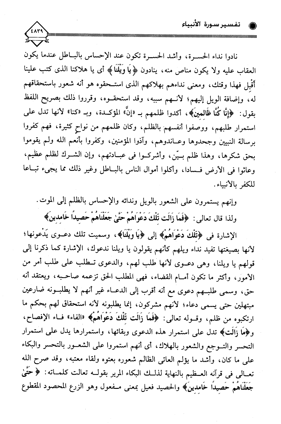 الإشارة في (تِّلْكَ دَعْوَاهُمْ) إلى (يَا وَيْلَنَا)، وسميت تلك دعوى يَدْعونها؛ لأنها بصيغتها تفيد نداء ويلهم كأنهم يقولون يا ويلنا ندعوك، الإشارة كما ذكرنا إلى قولهم يا ويلنا، وهي دعوى لأنها طلب لهم، والدعوى تطلب على طلب أمر من الأمور، وأكثر ما تكون أمام القضاء، فهي المطلب الحق تزعمه صاحبه، ويعتقد أنه حق، وسمي طلبهم دعوى مع أنه أقرب إلى الدعاء غير أنهم لَا يطلبونه ضارعين مبتهلين حتى يسمى دعاء، لأنهم مشركون، إنما يطلبونه لأنه استحقاق لهم بحكم ما ارتكبوه من ظلم، وقوله تعالى: (فَمَا زَالَتْ تِلْكَ دَعْوَاهُمْ) " الفاء " فاء الإفصاح، و (مَا زَالَت) تدل على استمرار هذه الدعوى وبقائها، واستمرارها يدل على استمرار التحسر والتوجع والشعور بالهلاك، أي أنهم استمروا على الشعور بالتحسر والبكاء على ما كان، وأشد ما يؤلم العاتي الظالم شعوره بعتوه ولقاء معتبه، وقد صرح الله تعالى في قرآنه العظيم بالنهاية لذلك البكاء المرير بقوله تعالت كلماته: (حَتَّى جَعَلْنَاهُمْ حَصِيدًا خَامِدِين) والحصيد فعيل بمعنى مفعول وهو الزرع المحصود المقطوع