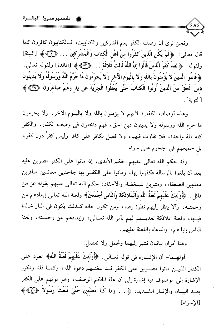 ونحن نرى أن وصف الكفر يعم المشركين والكتابيين، فالكتابيون كافرون كما قال تعالى: (لَمْ يَكُنِ الَّذِينَ كَفَرُوا مِنْ أَهْلِ الْكِتَابِ وَالْمُشْرِكِينَ. . .)، ولقوله: (لَقَدْ كَفَرَ الَّذِينَ قَالُوا إِنَّ اللَّهَ ثَالِثُ ثَلاثَةٍ. . .)، ولقوله تعالى: (قَاتِلُوا الَّذِينَ لَا يُؤْمِنُونَ بِاللَّهِ وَلا بِالْيَوْمِ الآخِرِ وَلا يُحَرِّمُونَ مَا حَرَّمَ اللَّهُ وَرَسُولُهُ وَلا يَدِينونَ دِينَ الْحَقِّ مِنَ الَّذِينَ أُوتُوا الْكِتَابَ حَتَّى يُعْطُوا الْجِزْيَةَ عَن يَدٍ وَهُمْ صَاغِرُونَ).