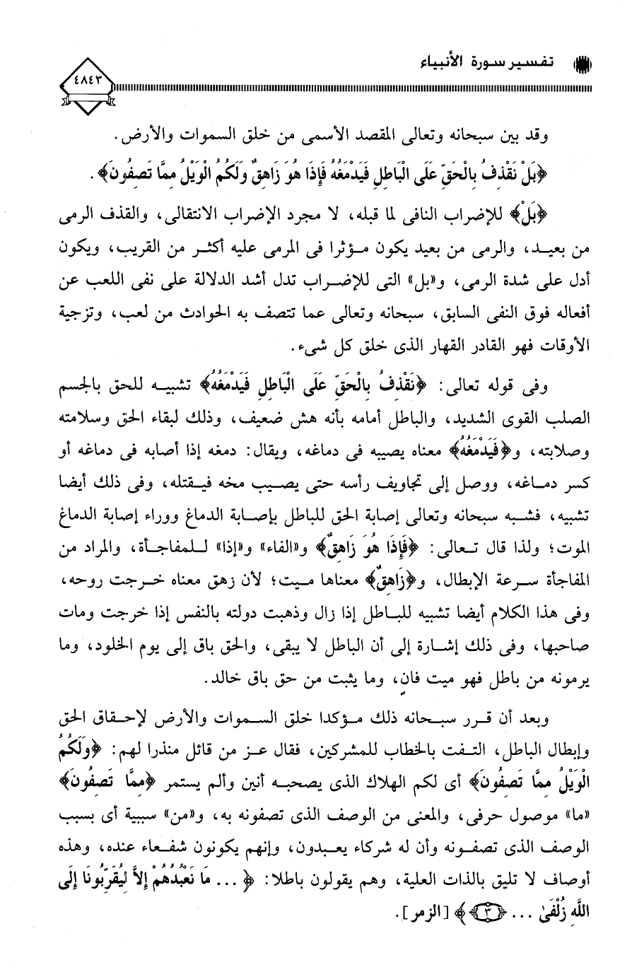 (بَلْ) للإضراب النافي لما قبله، لَا مجرد الإضراب الانتقالي، والقذف الرمي من بعيد، والرمي من بعيد يكون مؤثرا في المرمى عليه أكثر من القريب، ويكون أدل على شدة الرمي، و " بل " التي للإضراب تدل أشد الدلالة على نفي اللعب عن أفعاله فوق النفي السابق، سبحانه وتعالى عما تتصف به الحوادث من لعب،، وتزجية الأوقات فهو القادر القهار الذي خلق كل شيء.