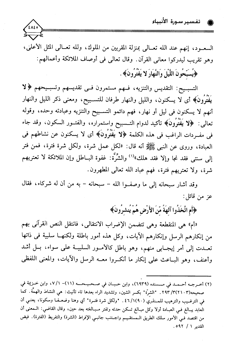 التسبيح: التقديس والتنزيه، فهم مستمرون في تقديسهم وتسبيحهم (لا يَفْتُرونَ) أي لَا يسكنون، والليل والنهار طرفان للتسبيح، ومعنى ذكر الليل والنهار أنهم لَا يسكنون في ليل أو نهار، فهم دائمو التسبيح والتنزيه وعبادته وحده، وقوله تعالى: (لَا يَفْتُرُونَ) تأكيد لدوام التسبيح واستمراره، والفتور السكون. وقد جاء في مفردات الراغب في هذه الكلمة (لا يَفْتُرُونَ) أي لَا يسكنون عن نشاطهم في العبادة، وروي عن النبي - صلى الله عليه وسلم - أنه قال: " لكل عمل شرة، ولكل شرة فترة، فمن فتر إلى سنتي فقد نجا وإلا فقد هلك " (¬1) والشِّرَّة: غفوة الباطل وإن الملائكة لَا تعتريهم شرة، ولا تعتريهم فترة، فهم عباد الله تعالى المطهرون.