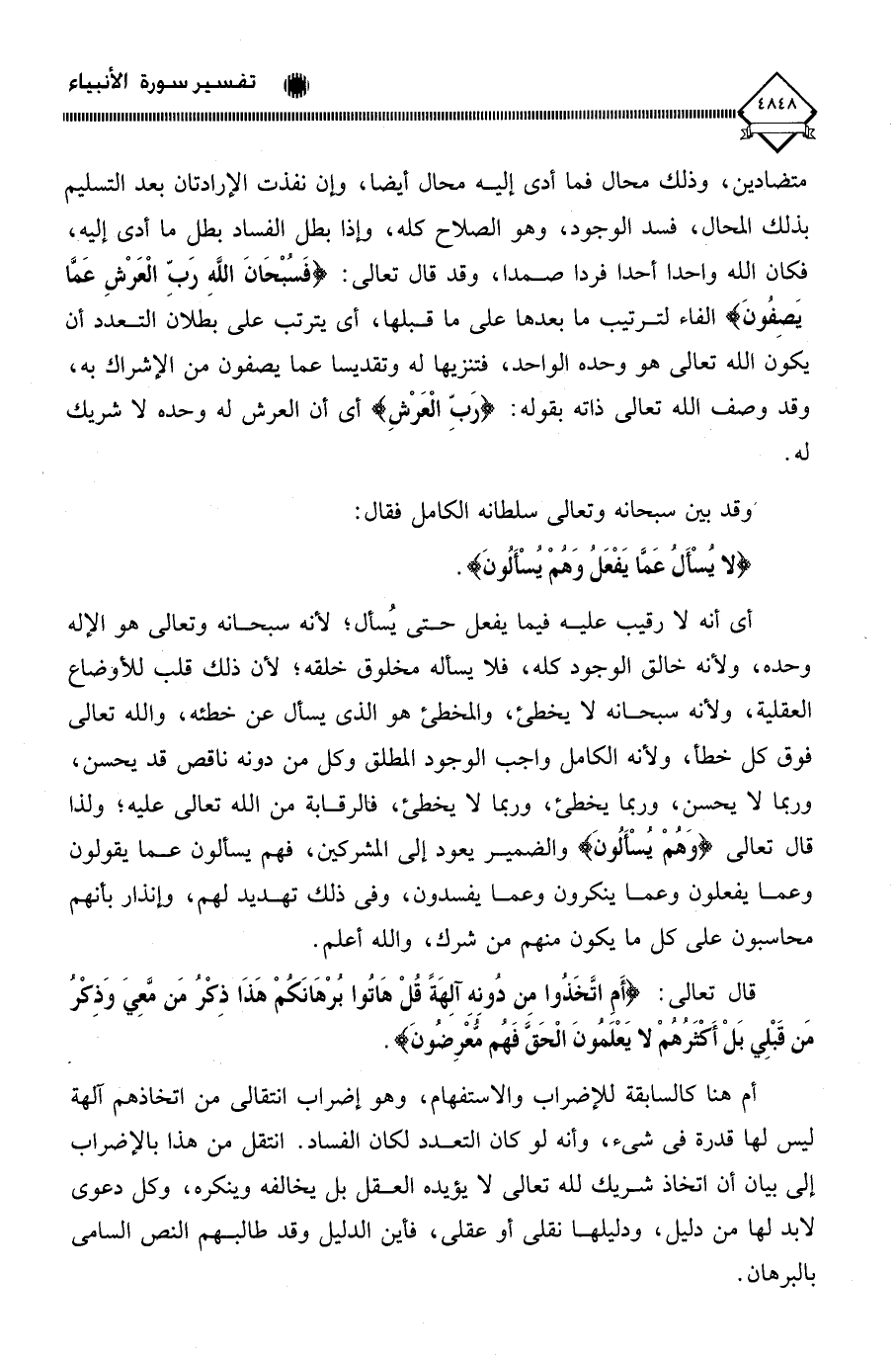 متضادين، وذلك محال فما أدى إليه محال أيضا، وإن نفذت الإرادتان بعد التسليم بذلك المحال، فسد الوجود، وهو الصلاح كله، وإذا بطل الفساد بطل ما أدى إليه، فكان الله واحدا أحدا فردا صمدا، وقد قال تعالى: (فَسُبْحَانَ اللَّهِ ربِّ الْعَرْشِ عَمَّا يَصِفُونَ) الفاء لترتيب ما بعدها على ما قبلها، أي يترتب على بطلان التعدد أن يكون الله تعالى هو وحده الواحد، فتنزيها له وتقديسا عما يصفون من الإشراك به، وقد وصف الله تعالى ذاته بقوله: رَبِّ الْعَرْشِ) أي أن العرش له وحده لَا شريك له.