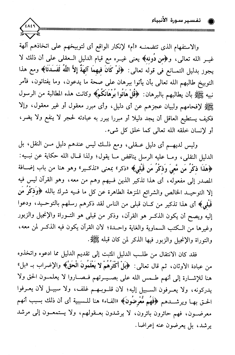 فقد كان الانتقال من طلب الدليل المثبت إلى تقديم الدليل مما ادعوه واتخذوه من عبادة الأوثان، ثم قال تعالى: (بَلْ أَكْثَرُهُمْ لَا يَعْلَمُونَ الْحَقَّ) والإضراب بـ " بل " هنا للإشارة إلى أنهم طمس الله على بصيرتهم فصاروا لَا يعلمون الحق ولا يدركونه، ولا يعرفون السبيل إليه، لأن قلوبهم غلف، ولا سبيل لأن يعرفوا الحق بها ويرشدهم (فَهُم مُّعْرِضُونَ) " الفاء " هنا للسببية أي أن ذلك بسبب أنهم معرضون، فهم حائرون بائرون، لَا يرشدون بعقولهم، ولا يستمعون إلى مرشد يرشد، بل يعوضون عنه إعراضا.