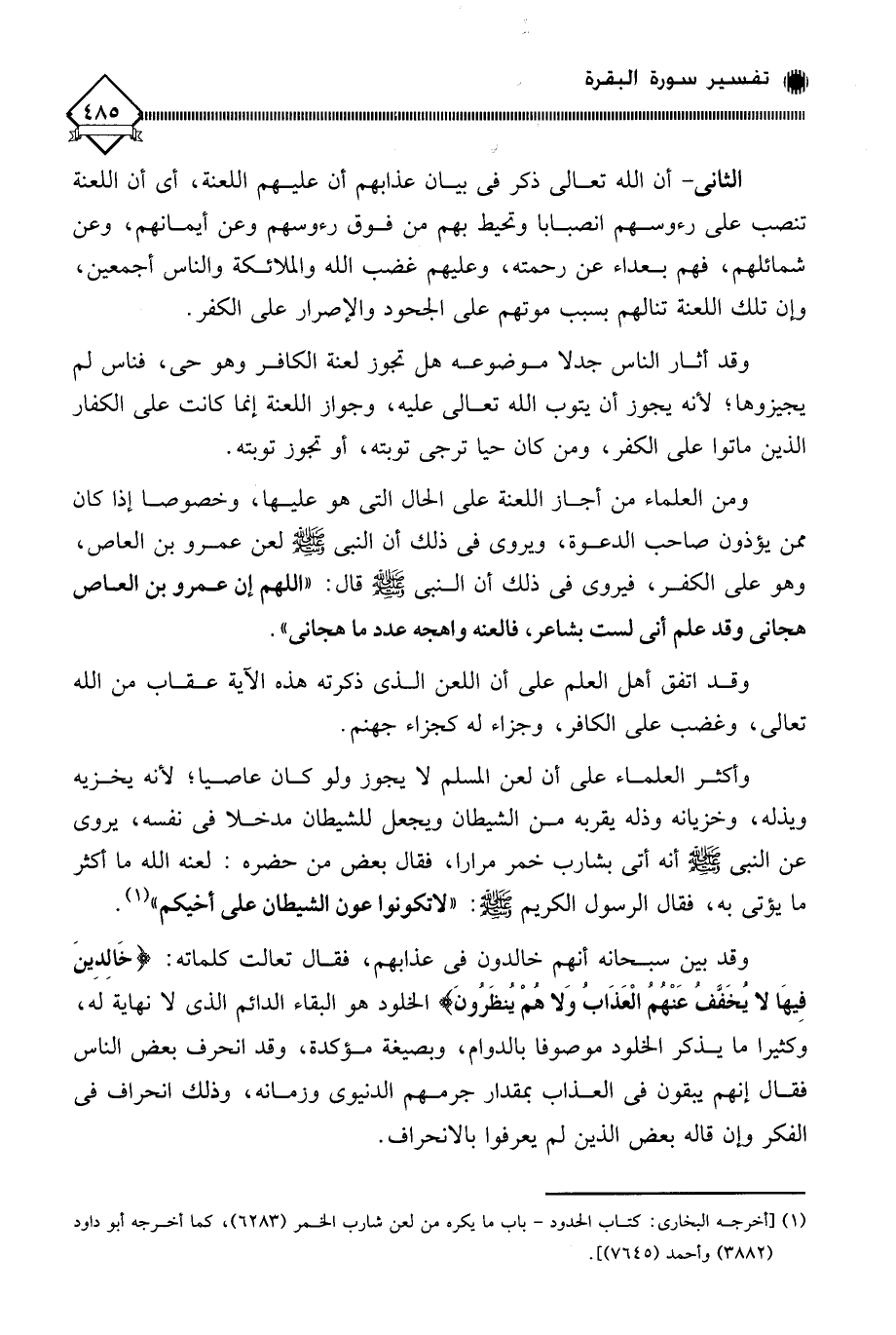 ومن العلماء من أجاز اللعنة على الحال التي هو عليها، وخصوصا إذا كان ممن يؤذون صاحب الدعوة، ويروى في ذلك أن النبي - صلى الله عليه وسلم - لعن عمرو بن العاص، وهو على الكفر، فيروى في ذلك أن النبي - صلى الله عليه وسلم - قال: " اللهم إن عمرو بن العاص هجاني وقد علم أني لست بشاعر، فالعنه واهجه عدد ما هجاني ".