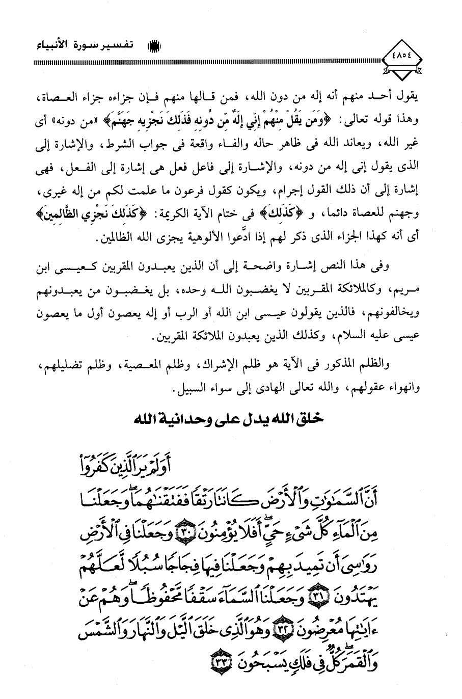 (أَوَلَمْ يَرَ الَّذِينَ كَفَرُوا أَنَّ السَّمَاوَاتِ وَالْأَرْضَ كَانَتَا رَتْقًا فَفَتَقْنَاهُمَا وَجَعَلْنَا مِنَ الْمَاءِ كُلَّ شَيْءٍ حَيٍّ أَفَلَا يُؤْمِنُونَ (30) وَجَعَلْنَا فِي الْأَرْضِ رَوَاسِيَ أَنْ تَمِيدَ بِهِمْ وَجَعَلْنَا فِيهَا فِجَاجًا سُبُلًا لَعَلَّهُمْ يَهْتَدُونَ (31) وَجَعَلْنَا السَّمَاءَ سَقْفًا مَحْفُوظًا وَهُمْ عَنْ آيَاتِهَا مُعْرِضُونَ (32) وَهُوَ الَّذِي خَلَقَ اللَّيْلَ وَالنَّهَارَ وَالشَّمْسَ وَالْقَمَرَ كُلٌّ فِي فَلَكٍ يَسْبَحُونَ (33)