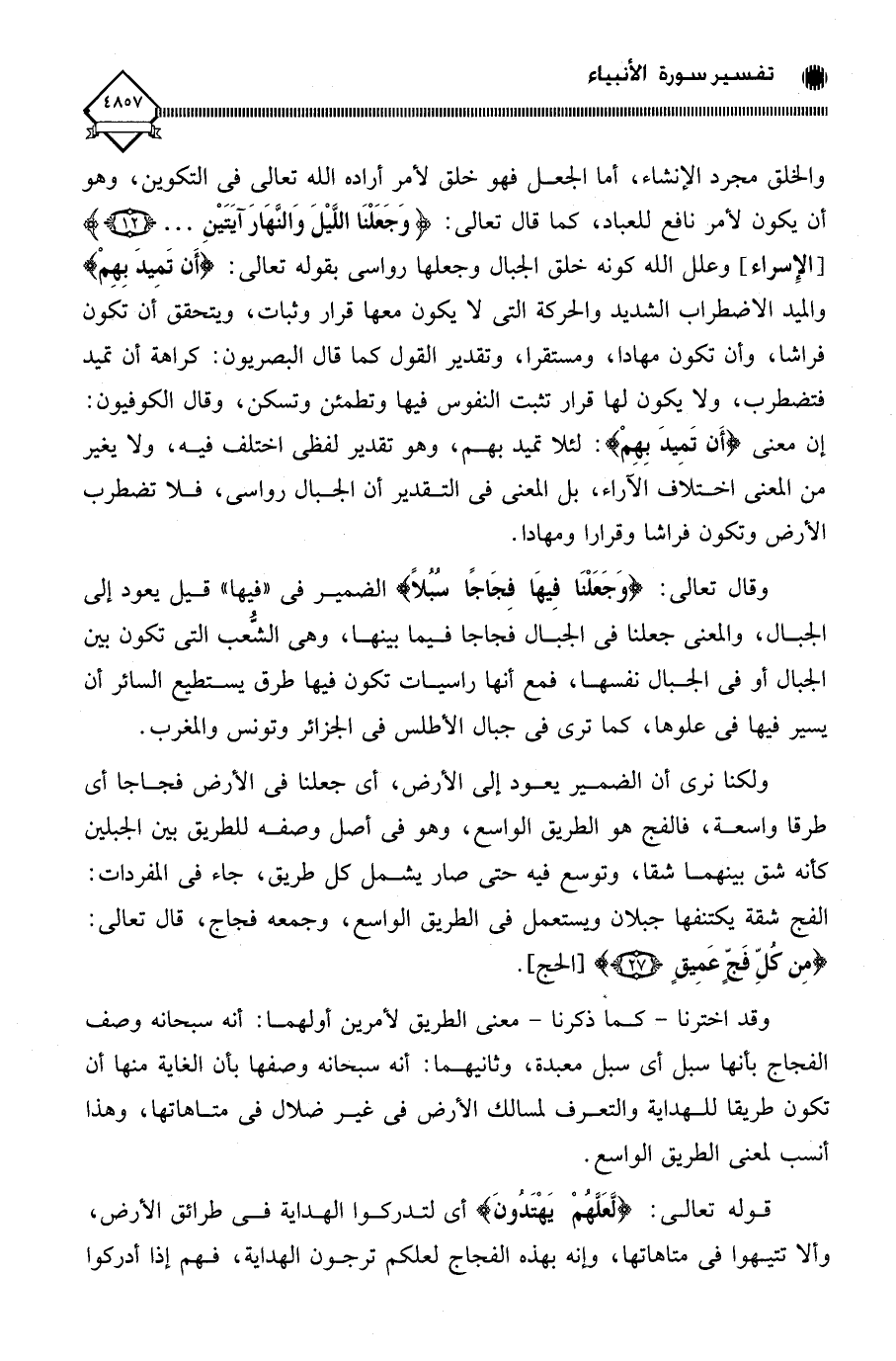 ولكنا نرى أن الضمير يعود إلى الأرض، أي جعلنا في الأرض فجاجا أي طرقا واسعة، فالفج هو الطريق الواسع، وهو في أصل وصفه للطريق بين الجبلين كأنه شق بينهما شقا، وتوسع فيه حتى صار يشمل كل طريق، جاء في المفردات: الفج شقة يكتنفها جبلان ويستعمل في الطريق الواسع، وجمعه فجاج، قال تعالى: