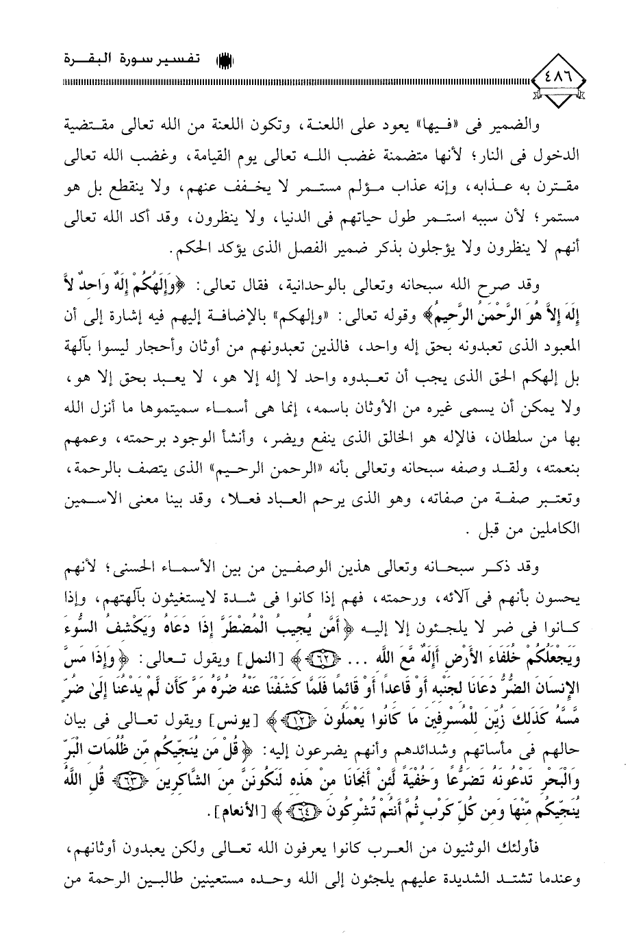 وقوله تعالى: " وإلهكم " بالإضافة إليهم فيه إشارة إلى أن المعبود الذي تعبدونه بحق إله واحد، فالذين تعبدونهم من أوثان وأحجار ليسوا بالهة بل إلهكم الحق الذي يجب أن تعبدوه واحد لَا إله إلا هو، لَا يعبد بحق إلا هو، ولا يمكن أن يسمى غيره من الأوثان باسمه، إنما هي أسماء سميتموها ما أنزل الله بها من سلطان، فالإله هو الخالق الذي ينفع ويضر، وأنشأ الوجود برحمته، وعمهم بنعمته، ولقد وصفه سبحانه وتعالى بأنه " الرحمن الرحيم " الذي يتصف بالرحمة، وتعتبر صفة من صفاته، وهو الذي يرحم العباد فعلا، وقد بينا معنى الاسمين الكاملين من قبل.
