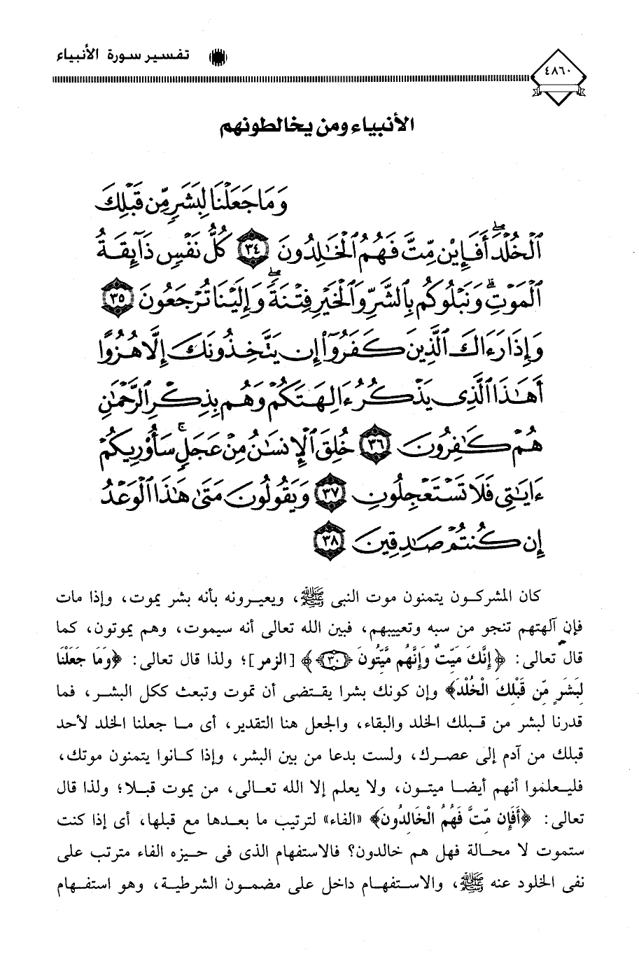 (وَمَا جَعَلْنَا لِبَشَرٍ مِنْ قَبْلِكَ الْخُلْدَ أَفَإِنْ مِتَّ فَهُمُ الْخَالِدُونَ (34) كُلُّ نَفْسٍ ذَائِقَةُ الْمَوْتِ وَنَبْلُوكُمْ بِالشَّرِّ وَالْخَيْرِ فِتْنَةً وَإِلَيْنَا تُرْجَعُونَ (35) وَإِذَا رَآكَ الَّذِينَ كَفَرُوا إِنْ يَتَّخِذُونَكَ إِلَّا هُزُوًا أَهَذَا الَّذِي يَذْكُرُ آلِهَتَكُمْ وَهُمْ بِذِكْرِ الرَّحْمَنِ هُمْ كَافِرُونَ (36) خُلِقَ الْإِنْسَانُ مِنْ عَجَلٍ سَأُرِيكُمْ آيَاتِي فَلَا تَسْتَعْجِلُونِ (37) وَيَقُولُونَ مَتَى هَذَا الْوَعْدُ إِنْ كُنْتُمْ صَادِقِينَ (38)