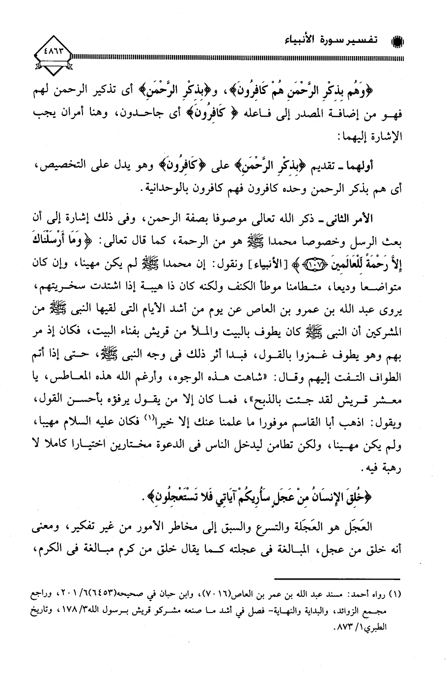 (وَهُم بِذِكْرِ الرَّحْمَنِ هُمْ كافِرُونَ)، و (بِذِكْرِ الرَّحْمَنِ) أي تذكير الرحمن لهم فهو من إضافة المصدر إلى فاعله (كَافِرُونَ) أي جاحدون، وهنا أمران يجب الإشارة إليهما:
