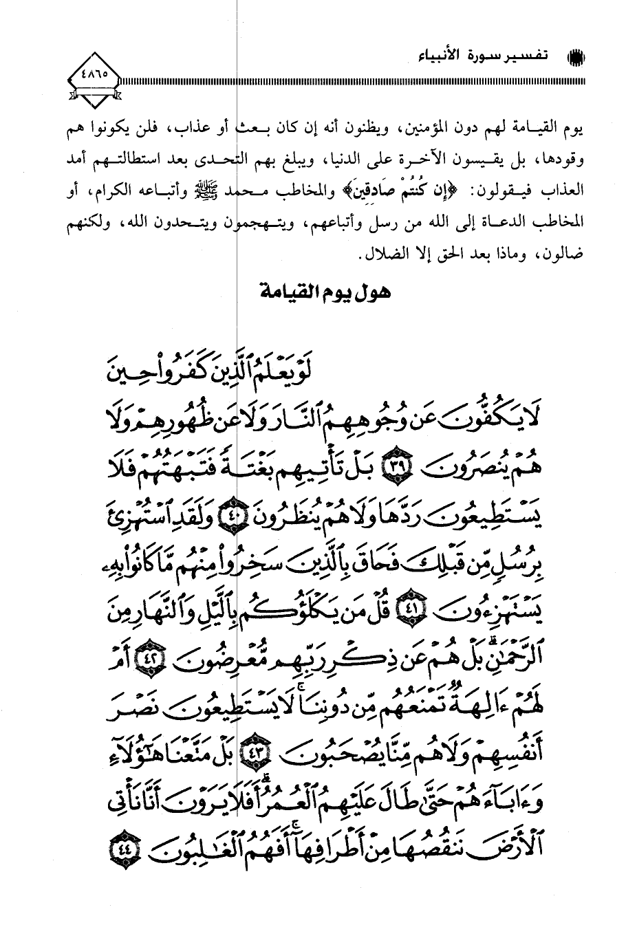 (لَوْ يَعْلَمُ الَّذِينَ كَفَرُوا حِينَ لَا يَكُفُّونَ عَنْ وُجُوهِهِمُ النَّارَ وَلَا عَنْ ظُهُورِهِمْ وَلَا هُمْ يُنْصَرُونَ (39) بَلْ تَأْتِيهِمْ بَغْتَةً فَتَبْهَتُهُمْ فَلَا يَسْتَطِيعُونَ رَدَّهَا وَلَا هُمْ يُنْظَرُونَ (40) وَلَقَدِ اسْتُهْزِئَ بِرُسُلٍ مِنْ قَبْلِكَ فَحَاقَ بِالَّذِينَ سَخِرُوا مِنْهُمْ مَا كَانُوا بِهِ يَسْتَهْزِءُونَ (41) قُلْ مَنْ يَكْلَؤُكُمْ بِاللَّيْلِ وَالنَّهَارِ مِنَ الرَّحْمَنِ بَلْ هُمْ عَنْ ذِكْرِ رَبِّهِمْ مُعْرِضُونَ (42) أَمْ لَهُمْ آلِهَةٌ تَمْنَعُهُمْ مِنْ دُونِنَا لَا يَسْتَطِيعُونَ نَصْرَ أَنْفُسِهِمْ وَلَا هُمْ مِنَّا يُصْحَبُونَ (43) بَلْ مَتَّعْنَا هَؤُلَاءِ وَآبَاءَهُمْ حَتَّى طَالَ عَلَيْهِمُ الْعُمُرُ أَفَلَا يَرَوْنَ أَنَّا نَأْتِي الْأَرْضَ نَنْقُصُهَا مِنْ أَطْرَافِهَا أَفَهُمُ الْغَالِبُونَ (44)