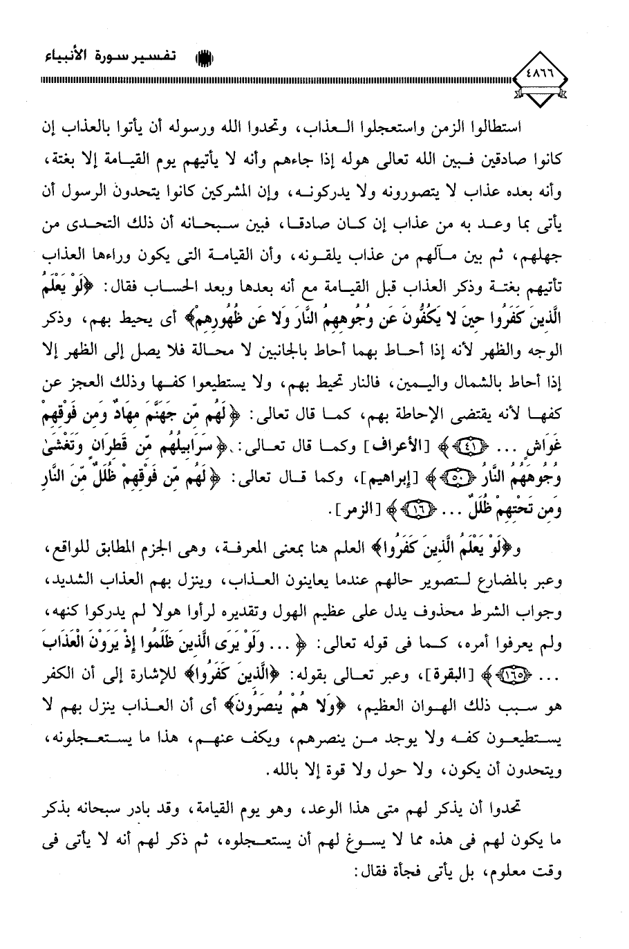 (لَوْ يَعْلَمُ الَّذِينَ كَفَرُوا حِينَ لَا يَكُفُّونَ عَنْ وُجُوهِهِمُ النَّارَ وَلَا عَنْ ظُهُورِهِمْ) أي يحيط بهم، وذكر الوجه والظهر لأنه إذا أحاط بهما أحاط بالجانبين لَا محالة فلا يصل إلى الظهر إلا إذا أحاط بالشمال واليمين، فالنار تحيط بهم، ولا يستطيعوا كفها وذلك العجز عن كفها لأنه يقتضي الإحاطة بهم، كما قال تعالى: (لَهُم مِّن جَهَنَّمَ مِهَادٌ وَمِن فَوْقِهِمْ غَوَاشٍ. . .)، وكما قال تعالى: (سَرَابِيلُهُم مِّن قَطِرَان وَتَغْشَى وُجُوهَهُمُ النَّارُ)، وكما قال تعالى: (لَهُم مِّن فَوْقِهِمْ ظُلَلٌ منَ النَّارِ وَمِن تَحْتِهِمْ ظُلَلٌ. . .).