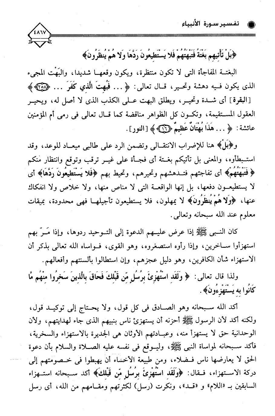 و (بَلْ) هنا للإضراب الانتقالي وتضمن الرد على طالبي ميعاد للوعد، وقد استبطأوه، والمعنى بل تأتيكم بغتة أي فجأة على غير ترقب وتوقع وانتظار منكم (فَتَبْهَتُهُمْ) أي تفاجئهم فتدهشهم وتحيرهم، وتحيط بهم (فَلا يَسْتَطِيعونَ رَدَّهَا) أي لا يستطيعون دفعها، بل إنها الواقعة التي لا مناص منها، ولا خلاص ولا انفكاك عنها، (وَلا هُمْ يُنظَرُونَ) لَا يمهلون، فلا يستطيعون تأجيلها فهي محدودة، بميقات معلوم عند الله سبحانه وتعالى.