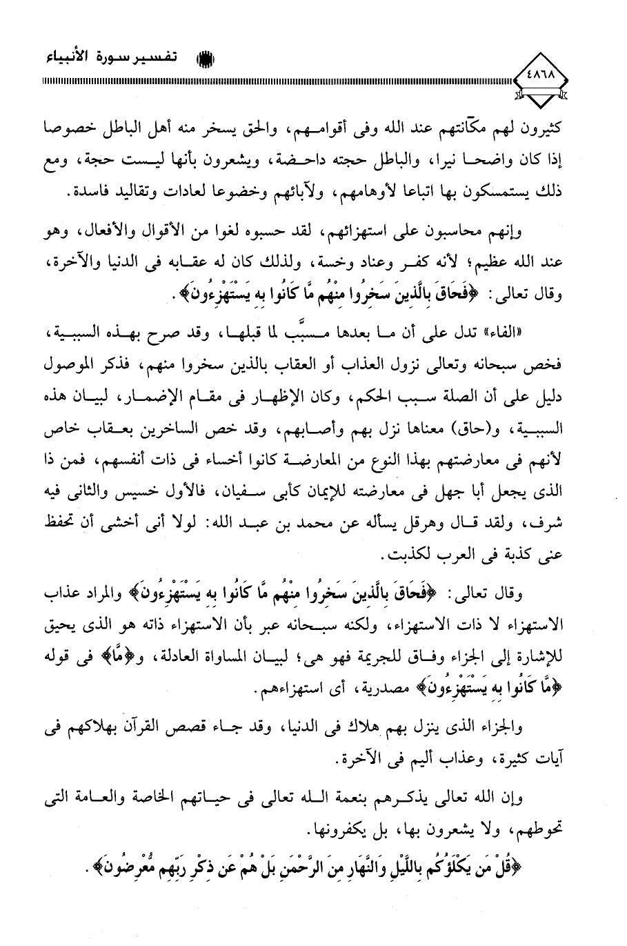وقال تعالى: (فَحَاقَ بِالَّذِينَ سَخِروا مِنْهُم مَّا كانُوا بِهِ يَسْتَهْزِءُونَ) والمراد عذاب الاستهزاء لَا ذات الاستهزاء، ولكنه سبحانه عبر بأن الاستهزاء ذاته هو الذي يحيق للإشارة إلى الجزاء وفاق للجريمة فهو هي؛ لبيان المساواة العادلة، و (مَا) في قوله (مَا كانُوأ يَسْتَهْزِءونَ) مصدرية، أي استهزاءهم.