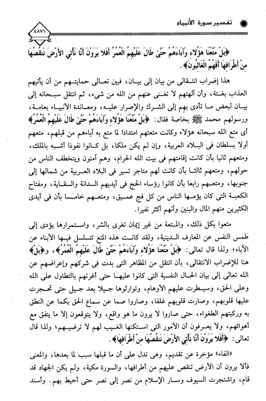 متعوا بكل ذلك، والمتعة من غير إيمان تُغري بالشر، واستمرارها يؤدي إلى طمس النفس عن المعارف الدينية، ولقد كانت هذه المتع تتسلسل فيها الأبناء عن الآباء؛ ولذا قال تعالى: (بَلْ مَتَّعْنَا هَؤُلَاءِ وَآبَاءَهُمْ حَتَّى طَالَ عَلَيْهِمُ الْعُمُرُ)، و (بَلْ) هنا للإضراب الانتقالي، بأن انتقل من المظاهر التي بدت في شركهم وإعراضهم عن الله تعالى إلى بيان الحال النفسية التي كانوا عليها حتى أغرتهم بالتطاول على الله وعلى الحق، وسيطرت عليهم الأوهام، وتوارثوها جيلا بعد جيل حتى تحجرت عليها قلوبهم، وصارت قلوبهم غلفا، وصاروا صما عن سماع الحق بكما عن النطق به وركبتهم الطغواء، حتى صاروا لَا يرون ما هو واقع، ولا يتوقعون إلا ما يتفق مع أهوائهم، ولا يعرفون أن الأمور التي استكنها الغيب لهم لَا ترضيهم؛ ولذا قال تعالى: (أَفَلَا يَرَوْنَ أَنَّا نَأْتِي الْأَرْضَ نَنْقُصُهَا مِنْ أَطْرَافِهَا).