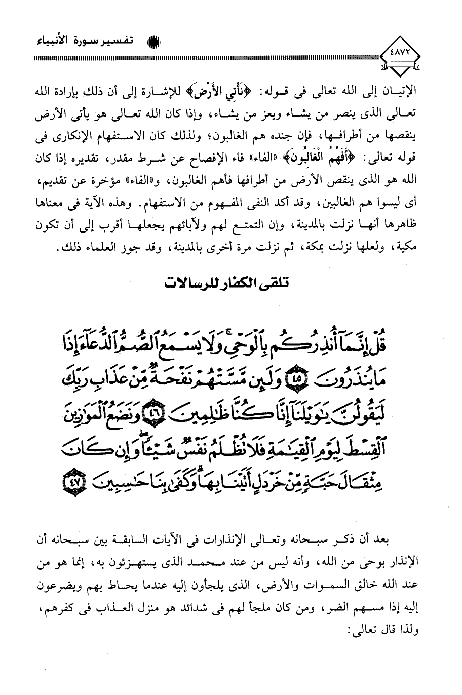 (قُلْ إِنَّمَا أُنْذِرُكُمْ بِالْوَحْيِ وَلَا يَسْمَعُ الصُّمُّ الدُّعَاءَ إِذَا مَا يُنْذَرُونَ (45) وَلَئِنْ مَسَّتْهُمْ نَفْحَةٌ مِنْ عَذَابِ رَبِّكَ لَيَقُولُنَّ يَا وَيْلَنَا إِنَّا كُنَّا ظَالِمِينَ (46) وَنَضَعُ الْمَوَازِينَ الْقِسْطَ لِيَوْمِ الْقِيَامَةِ فَلَا تُظْلَمُ نَفْسٌ شَيْئًا وَإِنْ كَانَ مِثْقَالَ حَبَّةٍ مِنْ خَرْدَلٍ أَتَيْنَا بِهَا وَكَفَى بِنَا حَاسِبِينَ (47)