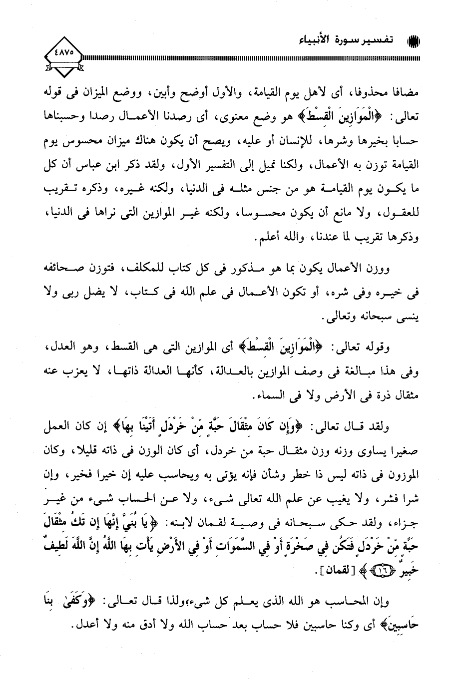 ولقد قال تعالى: (وَإِنْ كَانَ مِثْقَالَ حَبَّةٍ مِنْ خَرْدَلٍ أَتَيْنَا بِهَا) إن كان العمل صغيرا يساوي وزنه وزن مثقال حبة من خردل، أي كان الوزن في ذاته قليلا، وكان الموزون في ذاته ليس ذا خطر وشأن فإنه يُؤتى به ويحاسب عليه إن خيرا فخير، وإن شرا فشر، ولا يغيب عن علم الله تعالى شيء، ولا عن الحساب شيء من غير جزاء، ولقد حكى سبحانه في وصية لقمان لابنه: (يَا بُنَيَّ إِنَّهَا إِنْ تَكُ مِثْقَالَ حَبَّةٍ مِنْ خَرْدَلٍ فَتَكُنْ فِي صَخْرَةٍ أَوْ فِي السَّمَاوَاتِ أَوْ فِي الْأَرْضِ يَأْتِ بِهَا اللَّهُ إِنَّ اللَّهَ لَطِيفٌ خَبِيرٌ (16).