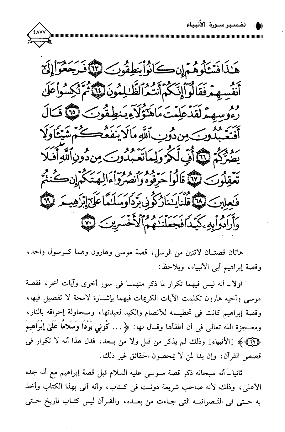 هَذَا فَاسْأَلُوهُمْ إِنْ كَانُوا يَنْطِقُونَ (63) فَرَجَعُوا إِلَى أَنْفُسِهِمْ فَقَالُوا إِنَّكُمْ أَنْتُمُ الظَّالِمُونَ (64) ثُمَّ نُكِسُوا عَلَى رُءُوسِهِمْ لَقَدْ عَلِمْتَ مَا هَؤُلَاءِ يَنْطِقُونَ (65) قَالَ أَفَتَعْبُدُونَ مِنْ دُونِ اللَّهِ مَا لَا يَنْفَعُكُمْ شَيْئًا وَلَا يَضُرُّكُمْ (66) أُفٍّ لَكُمْ وَلِمَا تَعْبُدُونَ مِنْ دُونِ اللَّهِ أَفَلَا تَعْقِلُونَ (67) قَالُوا حَرِّقُوهُ وَانْصُرُوا آلِهَتَكُمْ إِنْ كُنْتُمْ فَاعِلِينَ (68) قُلْنَا يَا نَارُ كُونِي بَرْدًا وَسَلَامًا عَلَى إِبْرَاهِيمَ (69) وَأَرَادُوا بِهِ كَيْدًا فَجَعَلْنَاهُمُ الْأَخْسَرِينَ (70)