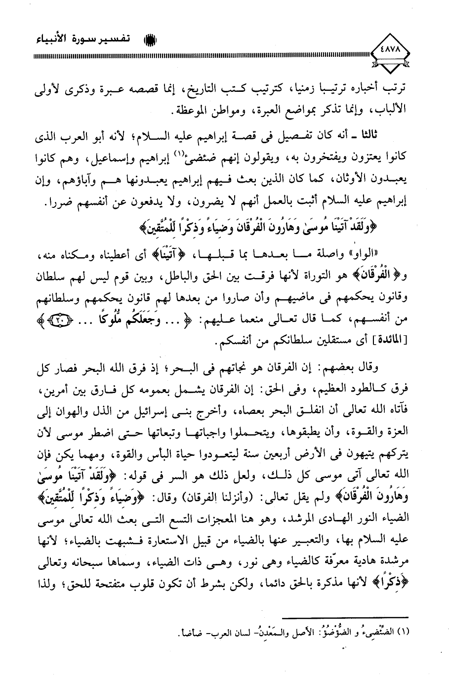 وقال بعضهم: إن الفرقان هو نجاتهم في البحر، إذ فرق الله البحر فصار كل فرق كالطود العظيم، وفي الحق: إن الفرقان يشمل بعمومه كل فارق بين أمرين، فآتاه الله تعالى أن انفلق البحر بعصاه، وأخرج بني إسرائيل من الذل والهوان إلى العزة والقوة، وأن يطبقوها، ويتحملوا واجباتها وتبعاتها حتى اضطر موسى لأن يتركهم يتيهون في الأرض أربعين سنة ليتعودوا حياة الباس والقوة، ومهما يكن فإن الله تعالى آتى موسى كل ذلك، ولعل ذلك هو السر في قوله: (وَلَقَدْ آتَيْنَا موسَى وَهَارُونَ الْفرْقَانَ) ولم يقل تعالى: " وأنزلنا الفرقان " وقال: (وَضِيَاءً وَذكْرًا لِلْمتَّقِينَ) الضياء النور الهادي المرشد، وهو هنا المعجزات التسع التي بعث اللَّه تعالى موسى عليه السلام بها، والتعبير عنها بالضياء من قبيل الاستعارة فشبهت بالضياء، لأنها مرشدة هادية معرّفة كالضياء وهي نور، وهي ذات الضياء، وسماها سبحانه وتعالى (ذِكْرًا) لأنها مذكرة بالحق دائما، ولكن بشرط أن تكون قلوب متفتحة للحق، ولذا