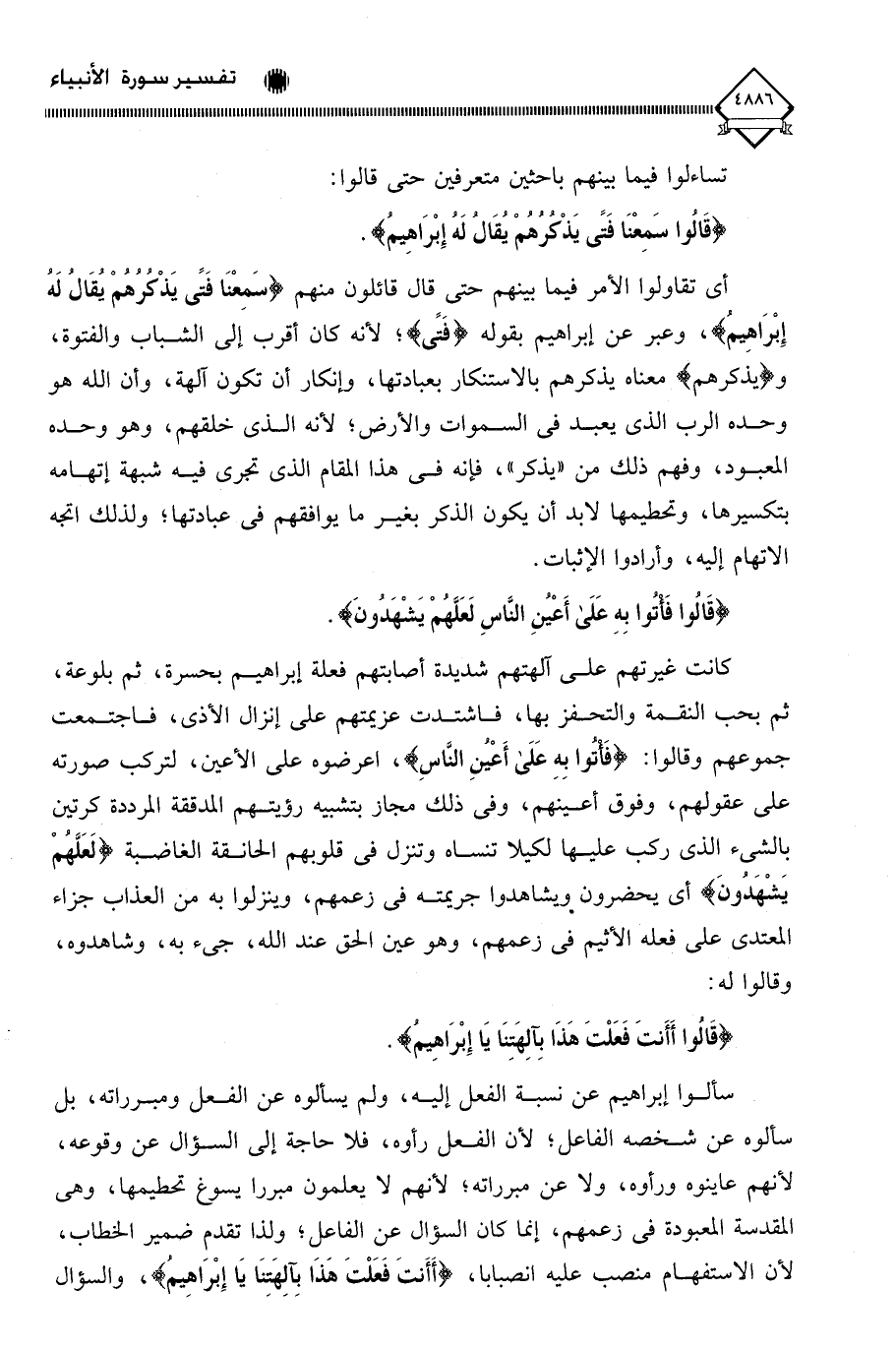 سألوا إبراهيم عن نسبة الفعل إليه، ولم يسألوه عن الفعل ومبرراته، بل سألوه عن شخصه الفاعل؛ لأن الفعل رأوه، فلا حاجة إلى السؤال عن وقوعه، لأنهم عاينوه ورأوه، ولا عن مبرراته؛ لأنهم لَا يعلمون مبررا يسوغ تحطيمها، وهي المقدسة المعبودة في زعمهم، إنما كان السؤال عن الفاعل، ولذا تقدم ضمير الخطاب، لأن الاستفهام منصب عليه انصبابا، (أَأَنْتَ فَعَلْتَ هَذَا بِآلِهَتِنَا يَا إِبْرَاهِيمُ)، والسؤال