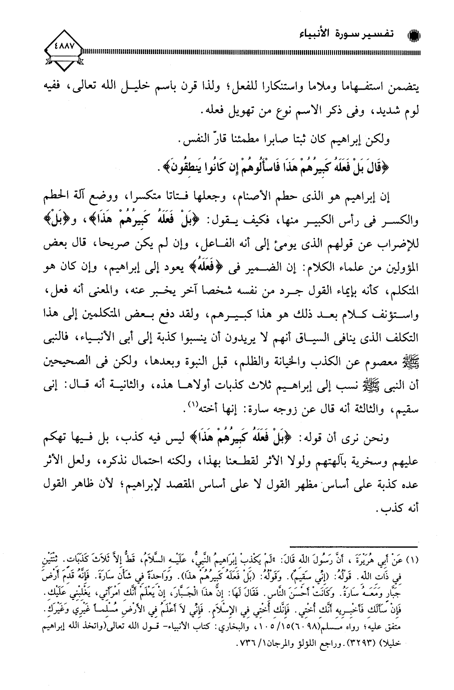 إن إبراهيم هو الذي حطم الأصنام، وجعلها فتاتا متكسرا، ووضع المة الحطم والكسر في رأس الكبير منها، فكيف يقول: (بَلْ فَعَلَهُ كَبِيرُهُمْ هَذَا)، و (بَلْ) للإضراب عن قولهم الذي يومئ إلى أنه الفاعل، وإن لم يكن صريحا، قال بعض المؤولين من علماء الكلام: إن الضمير في (فَعَلَهُ) يعود إلى إبراهيم، وإن كان هو المتكلم، كأنه بإيماء القول جرد من نفسه شخصا آخر يخبر عنه، والمعنى أنه فعل، واستؤنف كلام بعد ذلك هو هذا كبيرهم، ولقد دفع بعض المتكلمين إلى هذا التكلف الذي ينافي السياق أنهم لَا يريدون أن ينسبوا كذبة إلى أبي الأنبياء، فالنبي - صلى الله عليه وسلم - معصوم عن الكذب والخيانة والظلم، قبل النبوة وبعدها، ولكن في الصحيحين أن النبي - صلى الله عليه وسلم - نسب إلى إبراهيم ثلاث كذبات أولاها هذه، والثانية أنه قال: إني سقيم، والثالثة أنه قال عن زوجه سارة: إنها أخته (¬1).