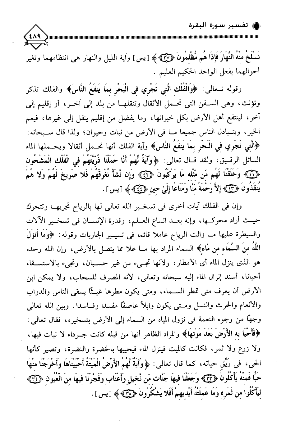 وإن في الفلك آيات أخرى في تسخير الله تعالى لها بالرياح تجريها وتتحرك حيث أراد محركها، وإنه بعد اتساع العلم، وقدرة الإنسان في تسخير الآلات والسيطرة عليها ما زالت الرياح عاملا قائما في تسيير الجاريات وقوله: (وَمَا أَنزَلَ اللَّه مِنَ السَّمَاءِ مِن مَّاء) السماء المراد بها ما علا مما يتصل بالأرض، وإن الله وحده هو الذي ينزل الماء أي الأمطار، ولأنها تجيء من غير حسبان، وتجيء بالاستسقاء أحيانا، أسند إنزال الماء إليه سبحانه وتعالى، لأنه المصرف للسحاب، ولا يمكن ابن الأرض أن يعرف متى تمطر السماء، ومتى يكون مطرها غيثًا يسقى الناس والدواب والأنعام والحرث والنسل ومتى يكون وابلًا عاصفًا مفسدا وفاسدا. وبين الله تعالى وجهًا من وجوه النعمة في نزول المياه من السماء إلى الأرض بتسخيره، فقال تعالى: (فَأحْيَا بِهِ الأَرْضَ بَعْدَ مَوْتِهَا) والمراد الظاهر أنها من قبله كانت جرداء لَا نبات فيها، ولا زرع ولا ثمر، فكانت كالميت فينزل الماء فيحييها بالخضرة والنضرة، وتصير كأنها الحي، في ريِّقِ حياته، كما قال تعالى: (وَآيَةٌ لَهُمُ الْأَرْضُ الْمَيْتَةُ أَحْيَيْنَاهَا وَأَخْرَجْنَا مِنْهَا حَبًّا فَمِنْهُ يَأْكُلُونَ (33) وَجَعَلْنَا فِيهَا جَنَّاتٍ مِنْ نَخِيلٍ وَأَعْنَابٍ وَفَجَّرْنَا فِيهَا مِنَ الْعُيُونِ (34) لِيَأْكُلُوا مِنْ ثَمَرِهِ وَمَا عَمِلَتْهُ أَيْدِيهِمْ أَفَلَا يَشْكُرُونَ (35).