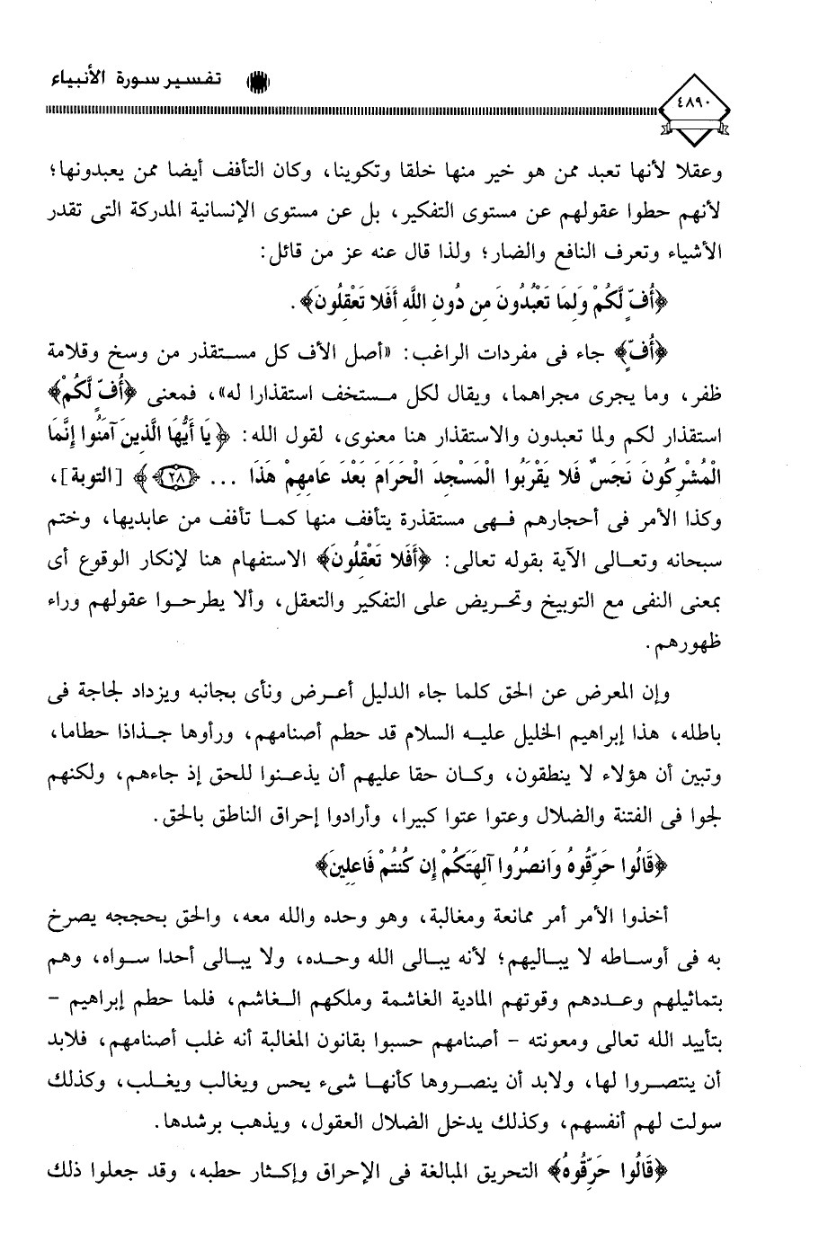 (أُفٍّ) جاء في مفردات الراغب: " أصل الأف كل مستقذر من وسخ وقلامة ظفر، وما يجري مجراهما، ويقال لكل مستخف استقذارا له "، فمعنى (أُفٍّ لكُمْ) استقذار لكم ولما تعبدون والاستقذار هنا معنوي، لقول الله: (يَا أَيُّهَا الَّذِينَ آمَنُوا إِنَّمَا الْمُشْرِكُونَ نَجَسٌ فَلَا يَقْرَبُوا الْمَسْجِدَ الْحَرَامَ بَعْدَ عَامِهِمْ هَذَا. . .)، وكذا الأمر في أحجارهم فهي مستقذرة يتأفف منها كما تأفف من عابديها، وختم سبحانه وتعالى الآية بقوله تعالى: (أَفَلا تَعْقِلُونَ) الاستفهام هنا لإنكار الوقوع أي بمعنى النفي مع التوبيخ وتحريض على التفكير والتعقل، وألا يطرحوا عقولهم وراء ظهورهم.