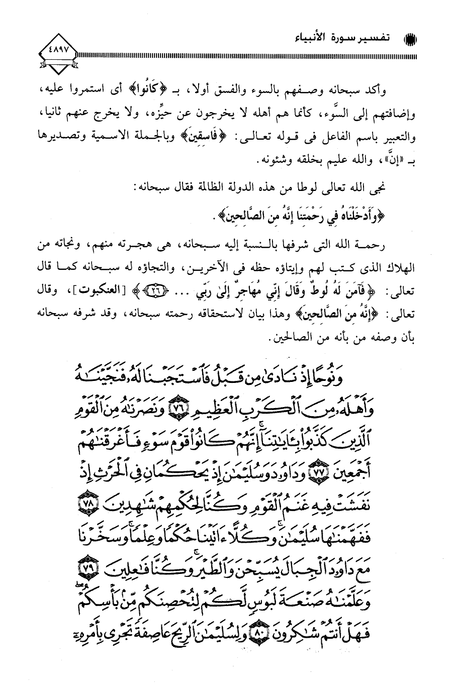 (وَنُوحًا إِذْ نَادَى مِنْ قَبْلُ فَاسْتَجَبْنَا لَهُ فَنَجَّيْنَاهُ وَأَهْلَهُ مِنَ الْكَرْبِ الْعَظِيمِ (76) وَنَصَرْنَاهُ مِنَ الْقَوْمِ الَّذِينَ كَذَّبُوا بِآيَاتِنَا إِنَّهُمْ كَانُوا قَوْمَ سَوْءٍ فَأَغْرَقْنَاهُمْ أَجْمَعِينَ (77) وَدَاوُودَ وَسُلَيْمَانَ إِذْ يَحْكُمَانِ فِي الْحَرْثِ إِذْ نَفَشَتْ فِيهِ غَنَمُ الْقَوْمِ وَكُنَّا لِحُكْمِهِمْ شَاهِدِينَ (78) فَفَهَّمْنَاهَا سُلَيْمَانَ وَكُلًّا آتَيْنَا حُكْمًا وَعِلْمًا وَسَخَّرْنَا مَعَ دَاوُودَ الْجِبَالَ يُسَبِّحْنَ وَالطَّيْرَ وَكُنَّا فَاعِلِينَ (79) وَعَلَّمْنَاهُ صَنْعَةَ لَبُوسٍ لَكُمْ لِتُحْصِنَكُمْ مِنْ بَأْسِكُمْ فَهَلْ أَنْتُمْ شَاكِرُونَ (80) وَلِسُلَيْمَانَ الرِّيحَ عَاصِفَةً تَجْرِي بِأَمْرِهِ