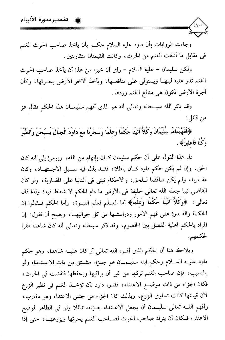 دل هذا القول على أن حكم سليمان كان بإلهام من الله، ويومئ إلى أنه كان الحق، وإن لم يكن حكم داود كان باطلا، فقد بذل فيه سبيل الاجتهاد، وكان مقاربا، ولم يكن مناقضا للحق، والأحكام تبنى في الدنيا على المقاربة، ولو كان القاضي نبيا جعله الله تعالى خليفة في الأرض ما دام الحكم لَا شطط فيه، ولذا قال تعالى: (وَكُلًّا آتَيْنَا حُكْمًا وَعِلْمًا) أما العلم فعلم النبوة، وأما الحكم فقالوا إن الحكمة والقدرة على فهم الأمور ودراستها من كل جوانبها، ويصح أن نقول: إن المراد بالحكم أهلية الفصل بين الخصوم، وقد ذكر سبحانه وتعالى أنه كان شاهدا مقرا لحكمهم.