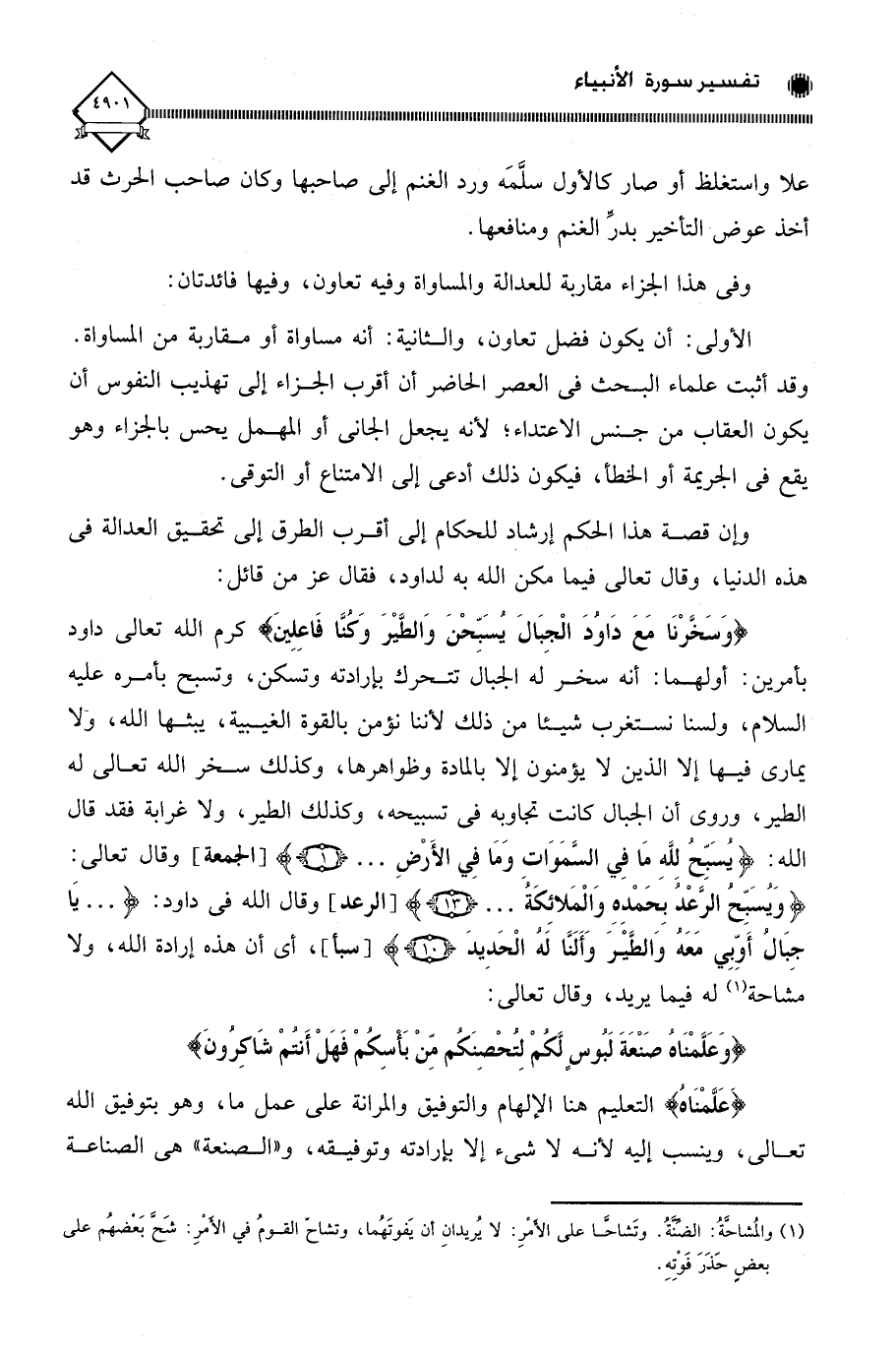 وإن قصة هذا الحكم إرشاد للحكام إلى أقرب الطرق إلى تحقيق العدالة في هذه الدنيا، وقال تعالى فيما مكن الله به لداود، فقال عز من قائل: (وَسَخَّرْنَا مَعَ دَاوُدَ الْجِبَالَ يسَبِّحْنَ وَالطَّيْرَ وَكنَّا فَاعِلِينَ) كرم الله تعالى داود بأمرين: أولهما: أنه سخر له الجبال تتحرك بإرادته وتسكن، وتسبح بأمره عليه السلام، ولسنا نستغرب شيئا من ذلك لأننا نؤمن بالقوة الغيبية، يبثها الله، ولا يماري فيها إلا الذين لَا يؤمنون إلا بالمادة وظواهرها، وكذلك سخر الله تعالى له الطير، وروي أن الجبال كانت تجاوبه في تسبيحه، وكذلك الطير، ولا غرابة فقد قال الله: (يُسَبِّحُ لِلَّهِ مَا فِي السَّمَوَات وَمَا فِي الأَرْضِ. . .)، وقال تعالى: (وَيُسَبِّحُ الرَّعْدُ بِحَمْدِهِ وَالْمَلائِكَةُ. . .)، وقال الله في داود: (. . . يَا جِبَالُ أَوِّبِي مَعَهُ وَالطَّيْرَ وَأَلَنَّا لَهُ الْحَدِيدَ)، أي أن هذه إرادة الله، ولا مشاحة (¬1) له فيما يريد، وقال تعالى: