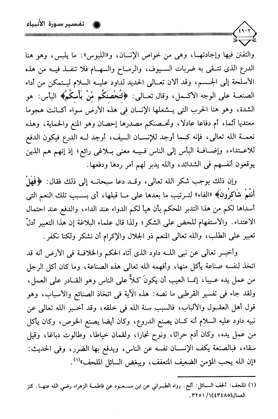 والتفنن فيها وإجادتها، وهي من خواص الإنسان، و " اللبوس " ما يلبس، وهو هنا الدرع الذي تتقى به ضربات السيوف، والرماح والسهام فلا تنفذ فيه من هذه الأسلحة إلى الجسم، وقد أَلانَ تعالى الحديد لداود عليه السلام ليتمكن من أداء الصنعة على الوجه الأكمل، وقال تعالى: (لِتُحْصِنَكُم مِّنْ بَأسِكُمْ) البأس: هو الشدة، وهو هنا الحرب التي يشعلها الإنسان في هذه الأرض سواء أكانت هجوما معتديا آثما، أم دفاعا عادلا، وتحصنكم مصدرها إحصان وهو المنع والحماية، وهذه نعمة الله تعالى، فإنه كما أوجد للإنسان السيف، أوجد له الدرع فيكون الدفع للاعتداء، وإضافة الباس إلى الناس فيه معنى بلاغي رائع؛ إذ إنهم هم الذين يوقعون أنفسهم في الشدائد، والله يدبر لهم أمر ردها ودفعها.