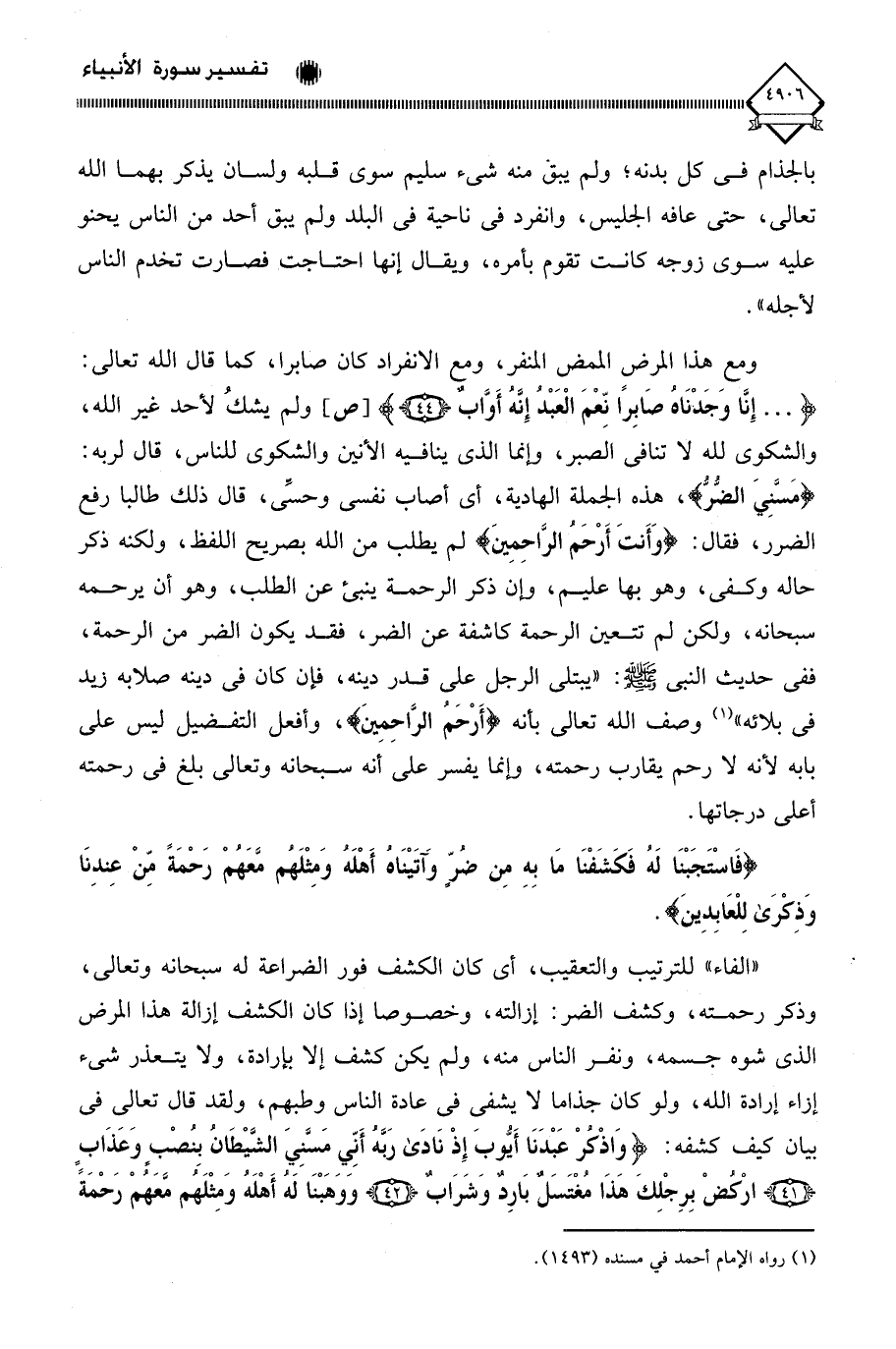 ومع هذا المرضِ الممض المنفر، ومع الانفراد كان صابرا، كما قال الله تعالى: (. . . إِنَّا وَجَدنَاهُ صَابِرًا نِّعْمَ الْعَبْدُ إِنَّه أَوَّابٌ)، ولم يشكُ لأحد غير الله، والشكوى لله لَا تنافي الصبر، وإنما الذي ينافيه الأنين والشكوى للناس، قال لربه: (مَسَّنِيَ الضُّرُّ)، هذه الجملة الهادية، أي أصاب نفسي وحسِّي، قال ذلك طالبا رفع الضرر، فقال: (وَأَنتَ أَرْحَمُ الرَّاحِمِينَ) لم يطلب من الله بصريح اللفظ، ولكنه ذكر حاله وكفى، وهو بها عليم، وإن ذكر الرحمة ينبئ عن الطلب، وهو أن يرحمه سبحانه، ولكن لم تتعين الرحمة كاشفة عن الضر، فقد يكون الضر من الرحمة، ففي حديث النبي - صلى الله عليه وسلم -: " يبتلى الرجل على قدر دينه، فإن كان في دينه صلابه زيد في بلائه " (¬1) وصف الله تعالى بأنه (أَرْحَمُ الرَّاحِمِينَ)، وأفعل التفضيل ليس على بابه لأنه لَا رحم يقارب رحمته، وإنما يفسر على أنه سبحانه وتعالى بلغ في رحمته أعلى درجاتها.